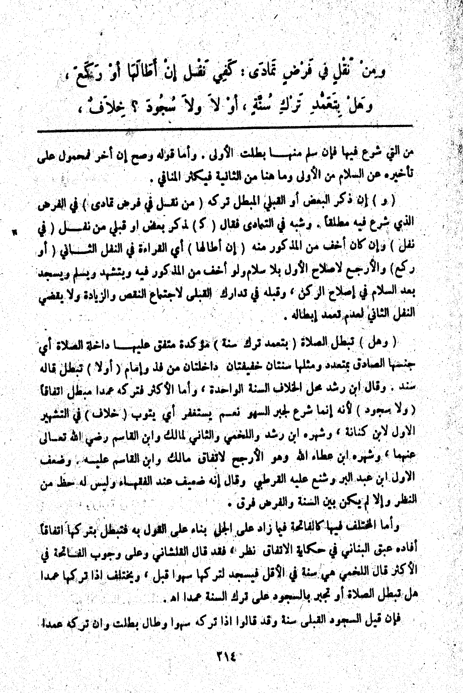 وَأَمَّا الْمُخْتَلَفُ فِيهَا كَالْفَاتِحَةِ فِيمَا زَادَ عَلَى الْجُلِّ بِنَاءً عَلَى الْقَوْلِ بِهِ فَتَبْطُلُ بِتَرْكِهَا اتِّفَاقًا أَفَادَهُ عبق الْبُنَانِيُّ فِي حِكَايَةِ الِاتِّفَاقِ نَظَرٌ، فَقَدْ قَالَ الْقَلْشَانِيُّ وَعَلَى وُجُوبِ الْفَاتِحَةِ فِي الْأَكْثَرِ قَالَ اللَّخْمِيُّ هِيَ سُنَّةٌ فِي الْأَقَلِّ فَيَسْجُدُ لِتَرْكِهَا سَهْوًا قَبْلُ، وَيَخْتَلِفُ إذَا تَرَكَهَا عَمْدًا هَلْ تَبْطُلُ الصَّلَاةُ أَوْ تُجْبَرُ بِالسُّجُودِ عَلَى تَرْكِ السُّنَّةِ عَمْدًا اهـ.