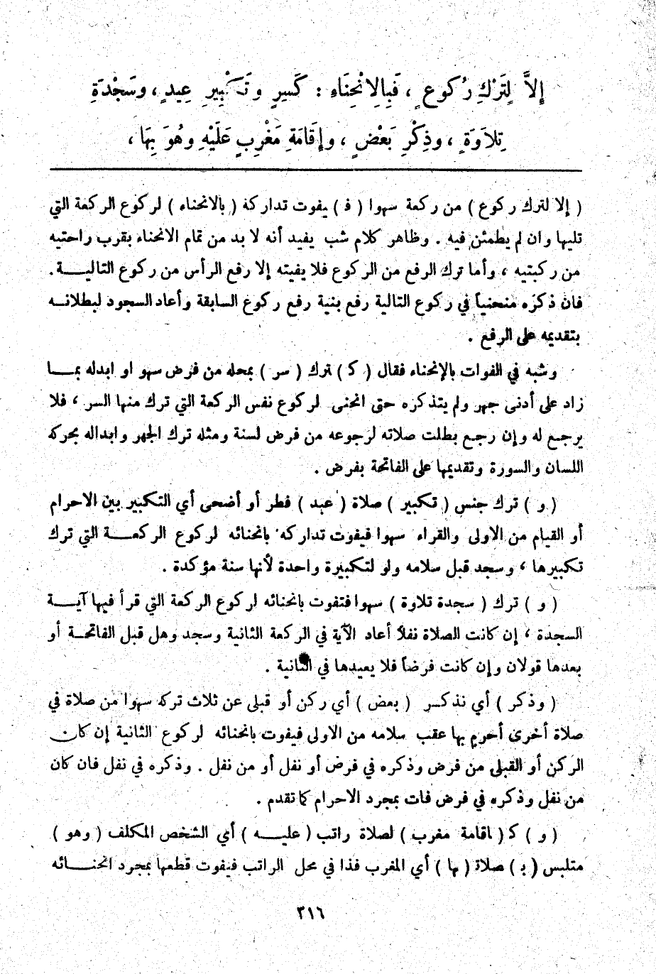 وَشَبَّهَ فِي الْفَوَاتِ بِالِانْحِنَاءِ فَقَالَ (كَ) تَرْكِ (سِرٍّ) بِمَحَلِّهِ مِنْ فَرْضِ سَهْوٍ أَوْ أَبْدَلَهُ بِمَا زَادَ عَلَى أَدْنَى جَهْرٍ وَلَمْ يَتَذَكَّرْهُ حَتَّى انْحَنَى لِرُكُوعِ نَفْسِ الرَّكْعَةِ الَّتِي تَرَكَ مِنْهَا السِّرَّ، فَلَا يَرْجِعُ لَهُ وَإِنْ رَجَعَ بَطَلَتْ صَلَاتُهُ لِرُجُوعِهِ مِنْ فَرْضٍ لِسُنَّةٍ وَمِثْلُهُ تَرْكُ الْجَهْرِ وَإِبْدَالُهُ بِحَرَكَةِ اللِّسَانِ وَالسُّورَةِ وَتَقْدِيمِهَا عَلَى الْفَاتِحَةِ بِفَرْضٍ.