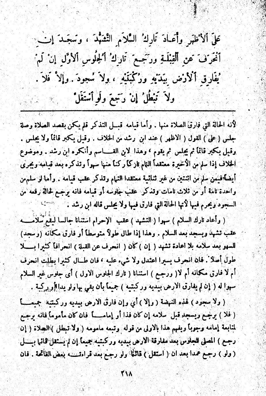 (وَأَعَادَ تَارِكُ السَّلَامِ) سَهْوًا (التَّشَهُّدَ) عَقِبَ الْإِحْرَامِ اسْتِنَانًا جَالِسًا لِيَقَعَ سَلَامُهُ عَقِبَ تَشَهُّدٍ وَيَسْجُدُ بَعْدَ السَّلَامِ. وَهَذَا إذَا طَالَ طُولًا مُتَوَسِّطًا أَوْ فَارَقَ مَكَانَهُ (وَسَجَدَ) لِلسَّهْوِ بَعْدَ سَلَامِهِ بِلَا إعَادَةِ تَشَهُّدٍ (إنْ) كَانَ (انْحَرَفَ عَنْ الْقِبْلَةِ) انْحِرَافًا كَثِيرًا بِلَا طُولٍ أَصْلًا. فَإِنْ انْحَرَفَ يَسِيرًا اعْتَدَلَ وَلَا شَيْءَ عَلَيْهِ، فَإِنْ طَالَ كَثِيرًا بَطَلَتْ انْحَرَفَ أَمْ لَا فَارَقَ مَكَانَهُ أَمْ لَا (وَرَجَعَ) اسْتِنَانًا (تَارِكُ الْجُلُوسِ الْأَوَّلِ) أَيْ جُلُوسِ غَيْرِ السَّلَامِ سَهْوًا لَهُ (إنْ لَمْ يُفَارِقْ الْأَرْضَ بِيَدَيْهِ وَرُكْبَتَيْهِ) جَمِيعًا بِأَنْ بَقِيَ بِهَا وَلَوْ يَدًا أَوْ رُكْبَةً.