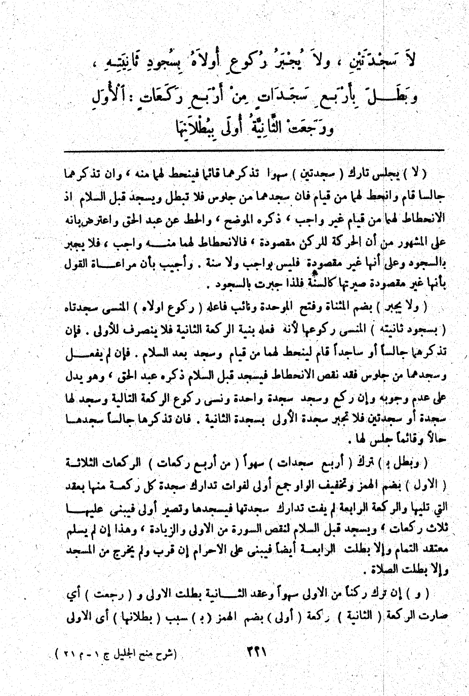 (وَلَا يُجْبَرُ) بِضَمِّ الْمُثَنَّاةِ وَفَتْحِ الْمُوَحَّدَةِ وَنَائِبُ فَاعِلِهِ (رُكُوعُ أَوَّلَاهُ) الْمَنْسِيِّ سَجْدَتَاهُ (بِسُجُودِ ثَانِيَتِهِ) الْمَنْسِيِّ رُكُوعُهَا لِأَنَّهُ فَعَلَهُ بِنِيَّةِ الرَّكْعَةِ الثَّانِيَةِ فَلَا يَنْصَرِفُ لِلْأُولَى. فَإِنْ تَذَكَّرَهُمَا جَالِسًا أَوْ سَاجِدًا قَامَ لِيَنْحَطَّ لَهُمَا مِنْ قِيَامٍ وَسَجَدَ بَعْدَ السَّلَامِ. فَإِنْ لَمْ يَفْعَلْ وَسَجَدَهُمَا مِنْ جُلُوسٍ فَقَدْ نَقَصَ الِانْحِطَاطُ فَيَسْجُدُ قَبْلَ السَّلَامِ ذَكَرَهُ عَبْدُ الْحَقِّ، وَهُوَ يَدُلُّ عَلَى عَدَمِ وُجُوبِهِ وَإِنْ رَكَعَ وَسَجَدَ سَجْدَةً وَاحِدَةً وَنَسِيَ رُكُوعَ الرَّكْعَةِ التَّالِيَةِ وَسَجَدَ لَهَا سَجْدَةً أَوْ سَجْدَتَيْنِ فَلَا تُجْبَرُ سَجْدَةُ الْأُولَى بِسَجْدَةِ الثَّانِيَةِ. فَإِنْ تَذَكَّرَهَا جَالِسًا سَجَدَهَا حَالًا وَقَائِمًا جَلَسَ لَهَا.
