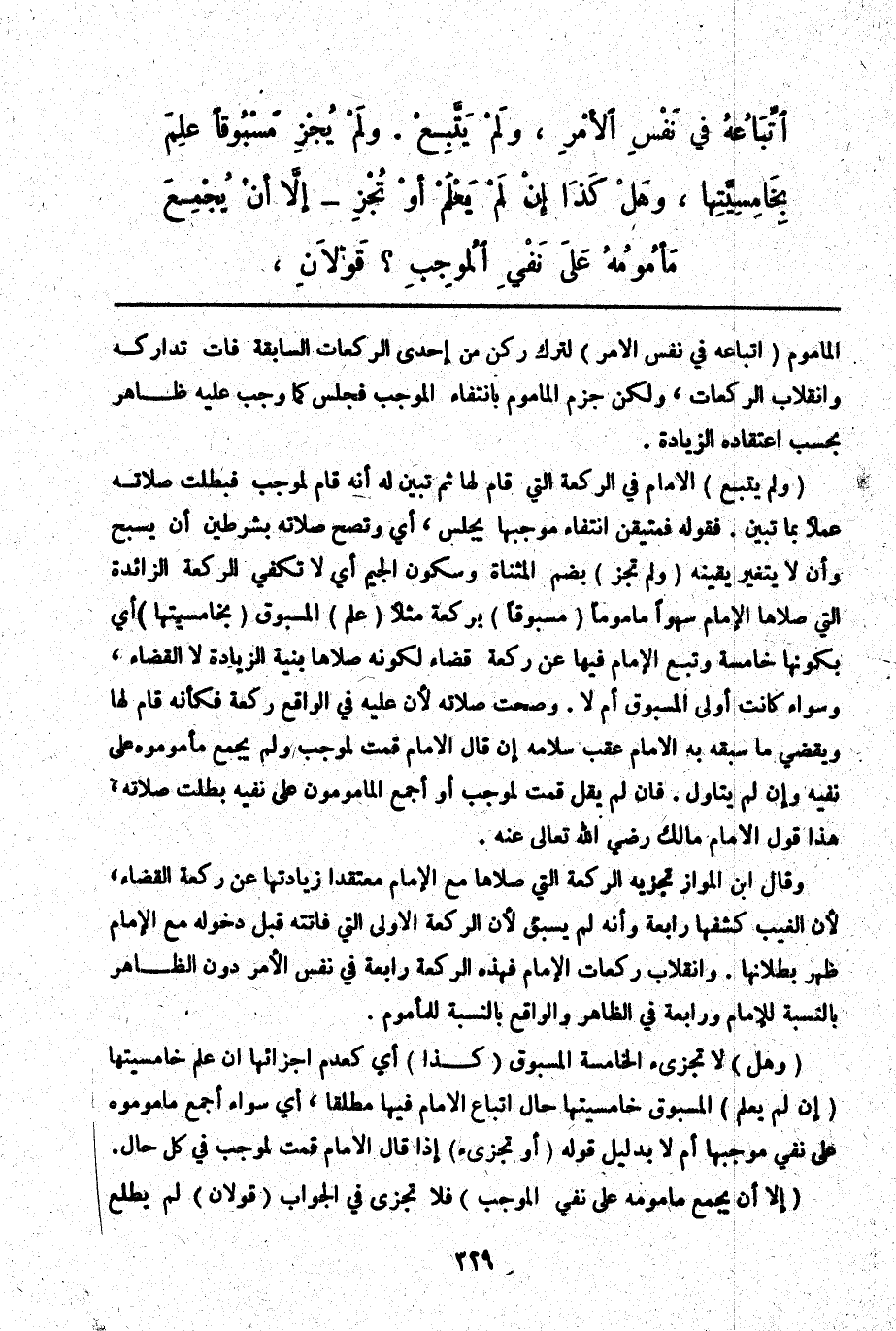 اتِّبَاعُهُ فِي نَفْسِ الْأَمْرِ، وَلَمْ يَتَّبِعْ. وَلَمْ يُجْزِ مَسْبُوقًا عَلِمَ بِخَامِسِيَّتِهَا، وَهَلْ كَذَا إنْ لَمْ يَعْلَمْ أَوْ تُجْزِ إلَّا أَنْ يَجْمَعَ مَأْمُومُهُ عَلَى نَفْيِ الْمُوجِبِ؟ قَوْلَانِ