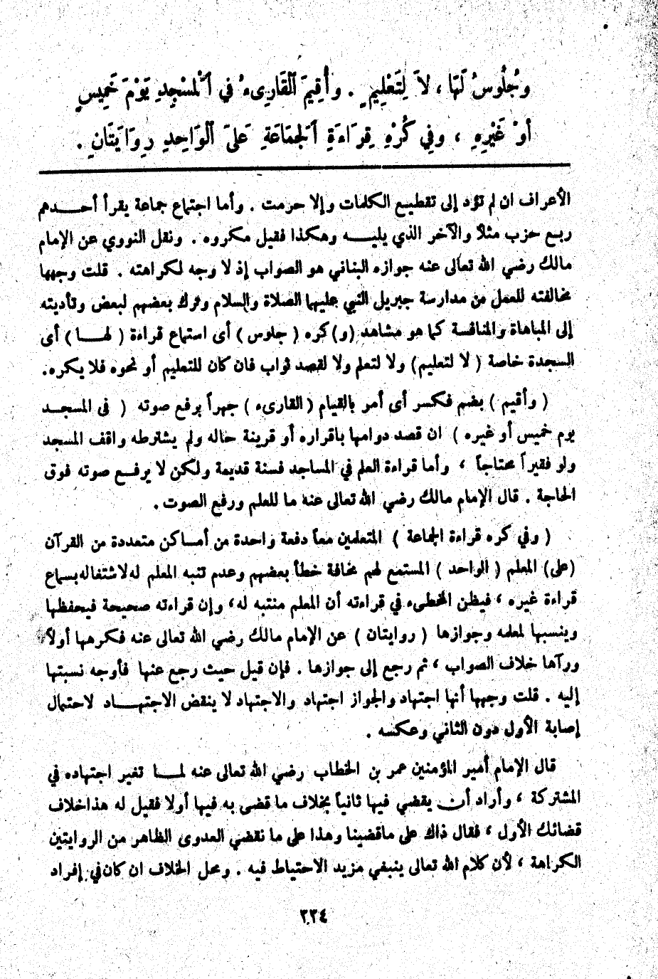 (وَفِي كُرْهِ قِرَاءَةِ الْجَمَاعَةِ) الْمُتَعَلِّمِينَ مَعًا دَفْعَةً وَاحِدَةً مِنْ أَمَاكِنَ مُتَعَدِّدَةٍ مِنْ الْقُرْآنِ (عَلَى) الْمُعَلِّمِ (الْوَاحِدِ) الْمُسْتَمِعِ لَهُمْ مَخَافَةَ خَطَأِ بَعْضِهِمْ وَعَدَمِ تَنَبُّهِ الْمُعَلِّمِ لَهُ لِاشْتِغَالِهِ بِسَمَاعِ قِرَاءَةِ غَيْرِهِ، فَيَظُنُّ الْمُخْطِئُ فِي قِرَاءَتِهِ أَنَّ الْمُعَلِّمَ مُتَنَبِّهٌ لَهُ، وَأَنَّ قِرَاءَتَهُ صَحِيحَةٌ فَيَحْفَظُهَا وَيَنْسُبُهَا لِمُعَلِّمِهِ وَجَوَازِهَا (رِوَايَتَانِ) عَنْ الْإِمَامِ مَالِكٍ - رَضِيَ اللَّهُ تَعَالَى عَنْهُ - فَكَرِهَهَا أَوَّلًا وَرَآهَا خِلَافَ الصَّوَابِ، ثُمَّ رَجَعَ إلَى جَوَازِهَا. فَإِنْ قِيلَ حَيْثُ رَجَعَ عَنْهَا فَأَوْجَهُ نِسْبَتُهَا إلَيْهِ. قُلْت وَجْهُهَا أَنَّهَا اجْتِهَادٌ وَالْجَوَازُ اجْتِهَادٌ وَالِاجْتِهَادُ لَا يَنْقُضُ الِاجْتِهَادَ لِاحْتِمَالِ إصَابَةِ الْأَوَّلِ دُونَ الثَّانِي وَعَكْسُهُ. قَالَ الْإِمَامُ أَمِيرُ الْمُؤْمِنِينَ عُمَرُ بْنُ الْخَطَّابِ - رَضِيَ اللَّهُ تَعَالَى عَنْهُ - لَمَّا تَغَيَّرَ اجْتِهَادُهُ فِي الْمُشْتَرَكَةِ، وَأَرَادَ أَنْ يَقْضِيَ فِيهَا ثَانِيًا بِخِلَافِ مَا قَضَى بِهِ فِيهَا أَوَّلًا فَقِيلَ لَهُ هَذَا خِلَافُ قَضَائِك الْأَوَّلِ، فَقَالَ ذَاكَ عَلَى مَا قَضَيْنَا وَهَذَا عَلَى مَا نَقْضِي الْعَدَوِيُّ الظَّاهِرُ مِنْ الرِّوَايَتَيْنِ الْكَرَاهَةُ لِأَنَّ كَلَامَ اللَّهِ تَعَالَى يَنْبَغِي مَزِيدُ الِاحْتِيَاطِ فِيهِ. وَمَحَلُّ الْخِلَافِ إنْ كَانَ فِي إفْرَادِ