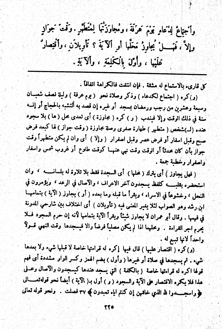(وَ) كُرِهَ (اقْتِصَارٌ عَلَيْهَا) قَالَ فِيهَا أَكْرَهُ لَهُ قِرَاءَتَهَا خَاصَّةً لَا قَبْلَهَا شَيْءٌ وَلَا بَعْدَهَا شَيْءٌ. ثُمَّ يَسْجُدُهَا فِي صَلَاةٍ أَوْ غَيْرِهَا (وَأُوِّلَ) بِضَمِّ الْهَمْزِ وَكَسْرِ الْوَاوِ مُشَدَّدَةً أَيْ فَهْمُ قَوْلِهَا أَكْرَهُ لَهُ قِرَاءَتَهَا خَاصَّةً (بِالْكَلِمَةِ) الَّتِي يَسْجُدُ عِنْدَهَا كَيَسْجُدُونَ وَالْآصَالِ وَعَلَى هَذَا فَلَا يُكْرَهُ الِاقْتِصَارُ عَلَى الْآيَةِ وَالسُّجُودِ (وَ) أُوِّلَ بِ (الْآيَةِ) أَيْضًا نَحْوَ قَوْله تَعَالَى {وَاسْجُدُوا لِلَّهِ الَّذِي خَلَقَهُنَّ إِنْ كُنْتُمْ إِيَّاهُ تَعْبُدُونَ} [فصلت: 37] . وَنَحْوَ قَوْله تَعَالَى