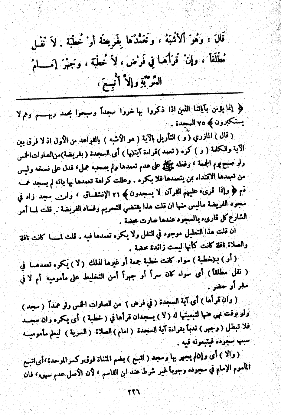 ـــــــــــــــــــــــــــــQ {إِنَّمَا يُؤْمِنُ بِآيَاتِنَا الَّذِينَ إِذَا ذُكِّرُوا بِهَا خَرُّوا سُجَّدًا وَسَبَّحُوا بِحَمْدِ رَبِّهِمْ وَهُمْ لا يَسْتَكْبِرُونَ} [السجدة: 15] (قَالَ) الْمَازِرِيُّ (وَ) التَّأْوِيلُ بِالْآيَةِ (هُوَ الْأَشْبَهُ) بِالْقَوَاعِدِ مِنْ الْأَوَّلِ إذْ لَا فَرْقَ بَيْنَ الْآيَةِ وَالْكَلِمَةِ