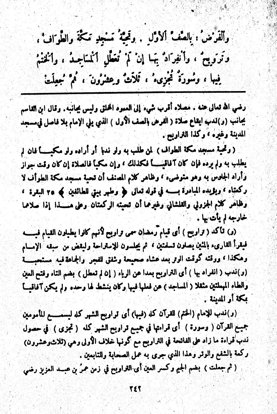 وَتَرَاوِيحٍ، وَانْفِرَادٌ بِهَا إنْ لَمْ تُعَطَّلْ الْمَسَاجِدُ، وَالْخَتْمُ فِيهَا، وَسُورَةٌ تُجْزِئُ، ثَلَاثٌ وَعِشْرُونَ، ثُمَّ جُعِلَتْ