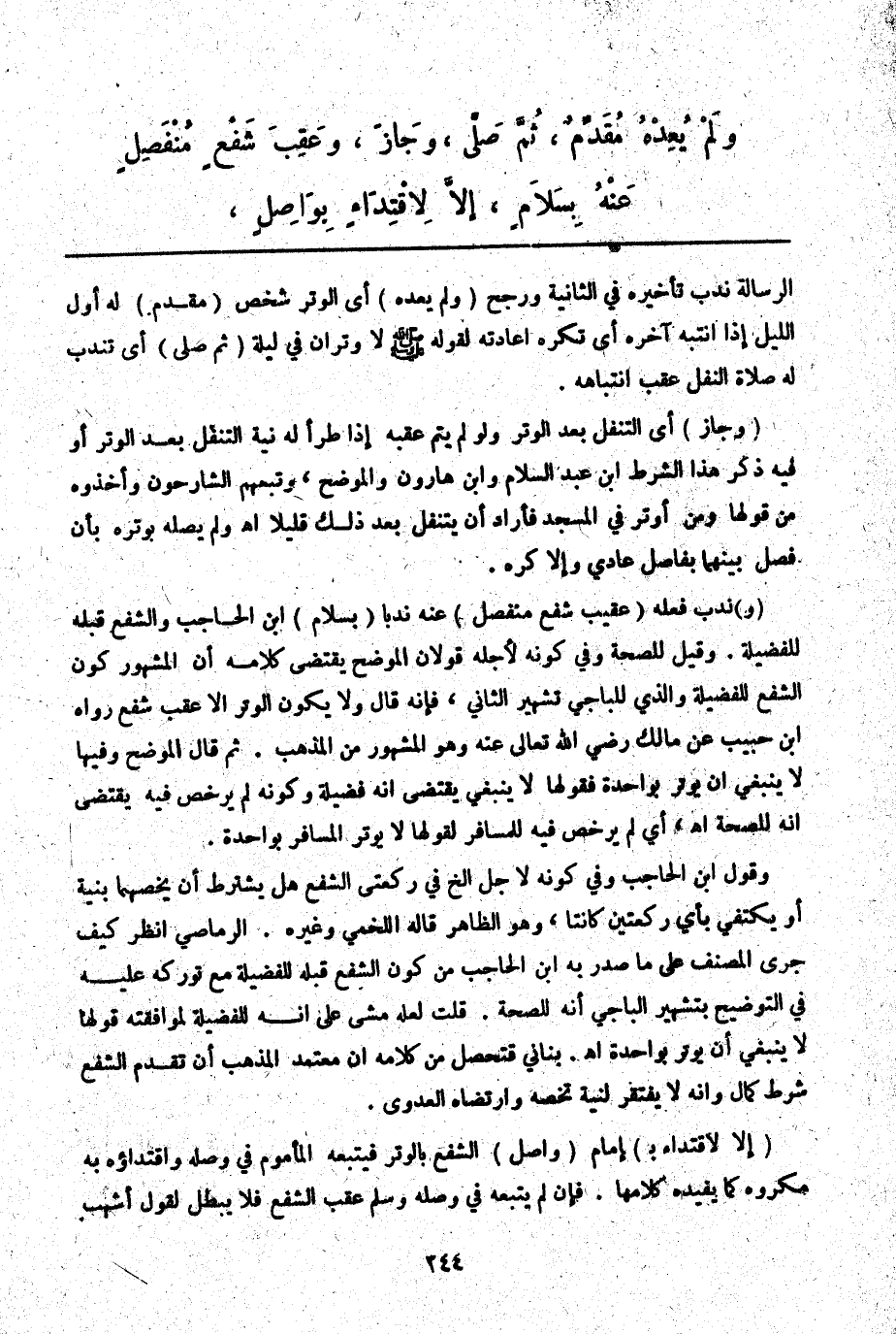 وَقَوْلُ ابْنِ الْحَاجِبِ وَفِي كَوْنِهِ لِأَجْلِ إلَخْ فِي رَكْعَتَيْ الشَّفْعِ هَلْ يُشْتَرَطُ أَنْ يَخُصَّهُمَا بِنِيَّةٍ أَوْ يَكْتَفِي بِأَيِّ رَكْعَتَيْنِ كَانَتَا، وَهُوَ الظَّاهِرُ قَالَهُ اللَّخْمِيُّ وَغَيْرُهُ. الرَّمَاصِيُّ اُنْظُرْ كَيْفَ جَرَى الْمُصَنِّفُ عَلَى مَا صَدَّرَ بِهِ ابْنُ الْحَاجِبِ مِنْ كَوْنِ الشَّفْعِ قَبْلَهُ لِلْفَضِيلَةِ مَعَ تَوَرُّكِهِ عَلَيْهِ فِي التَّوْضِيحِ بِتَشْهِيرِ الْبَاجِيَّ أَنَّهُ لِلصِّحَّةِ. قُلْت لَعَلَّهُ مَشَى عَلَى أَنَّهُ لِلْفَضِيلَةِ لِمُوَافَقَتِهِ قَوْلَهَا لَا يَنْبَغِي أَنْ يُوتِرَ بِوَاحِدَةٍ اهـ. بُنَانِيٌّ فَتَحَصَّلَ مِنْ كَلَامِهِ أَنَّ مُعْتَمَدَ الْمَذْهَبِ أَنَّ تَقَدُّمَ الشَّفْعِ شَرْطُ كَمَالٍ وَأَنَّهُ لَا يَفْتَقِرُ لِنِيَّةٍ تَخُصُّهُ وَارْتَضَاهُ الْعَدَوِيُّ. (إلَّا لِاقْتِدَاءٍ بِ) إمَامٍ (وَاصِلٍ) الشَّفْعَ بِالْوِتْرِ فَيَتْبَعُهُ الْمَأْمُومُ فِي وَصْلِهِ وَاقْتِدَاؤُهُ بِهِ مَكْرُوهٌ كَمَا يُفِيدُهُ كَلَامُهَا. فَإِنْ لَمْ يَتْبَعْهُ فِي وَصْلِهِ وَسَلَّمَ عَقِبَ الشَّفْعِ فَلَا يَبْطُلُ لِقَوْلِ أَشْهَبَ