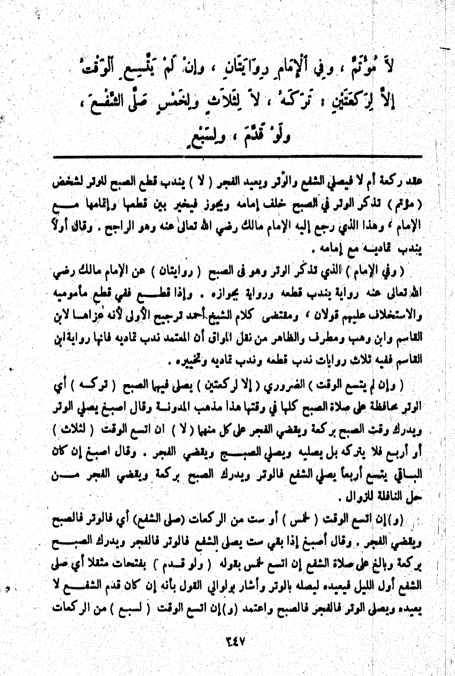 ـــــــــــــــــــــــــــــQعَقَدَ رَكْعَةً أَمْ لَا فَيُصَلِّي الشَّفْعَ وَالْوِتْرَ وَيُعِيدُ الْفَجْرَ (لَا) يُنْدَبُ قَطْعُ الصُّبْحِ لِلْوِتْرِ لِشَخْصٍ (مُؤْتَمٍّ) تَذَكَّرَ الْوِتْرَ فِي الصُّبْحِ خَلْفَ إمَامِهِ وَيَجُوزُ فَيُخَيَّرُ بَيْنَ قَطْعِهَا وَإِتْمَامِهَا مَعَ الْإِمَامِ، وَهَذَا الَّذِي رَجَعَ إلَيْهِ الْإِمَامُ مَالِكٌ - رَضِيَ اللَّهُ تَعَالَى عَنْهُ - وَهُوَ الرَّاجِحُ وَقَالَ أَوَّلًا يُنْدَبُ تَمَادِيهِ مَعَ إمَامِهِ.