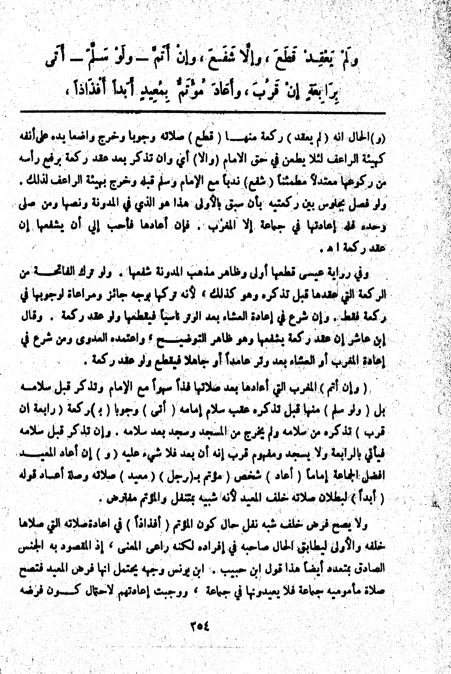 ـــــــــــــــــــــــــــــQوَ) الْحَالُ أَنَّهُ (لَمْ يَعْقِدْ) رَكْعَةً مِنْهَا (قَطَعَ) صَلَاتَهُ وُجُوبًا وَخَرَجَ وَاضِعًا يَدَهُ عَلَى أَنْفِهِ كَهَيْئَةِ الرَّاعِفِ لِئَلَّا يَطْعَنَ فِي حَقِّ الْإِمَامِ (وَإِلَّا) أَيْ وَإِنْ تَذَكَّرَ بَعْدَ عَقْدِ رَكْعَةٍ بِرَفْعِ رَأْسِهِ مِنْ رُكُوعِهَا مُعْتَدِلًا مُطْمَئِنًّا (شَفَعَ) نَدْبًا مَعَ الْإِمَامِ وَسَلَّمَ قَبْلَهُ وَخَرَجَ بِهَيْئَةِ الرَّاعِفِ لِذَلِكَ. وَلَوْ فَصَلَ بِجُلُوسٍ بَيْنَ رَكْعَتَيْهِ بِأَنْ سُبِقَ بِالْأُولَى هَذَا هُوَ الَّذِي فِي الْمُدَوَّنَةِ وَنَصُّهَا وَمَنْ صَلَّى وَحْدَهُ فَلَهُ إعَادَتُهَا فِي جَمَاعَةٍ إلَّا الْمَغْرِبَ. فَإِنْ أَعَادَهَا فَأَحَبُّ إلَيَّ أَنْ يَشْفَعَهَا إنْ عَقَدَ رَكْعَةً اهـ. وَفِي رِوَايَةِ عِيسَى قَطْعُهَا أَوْلَى وَظَاهِرُ مَذْهَبِ الْمُدَوَّنَةِ شَفْعُهَا.