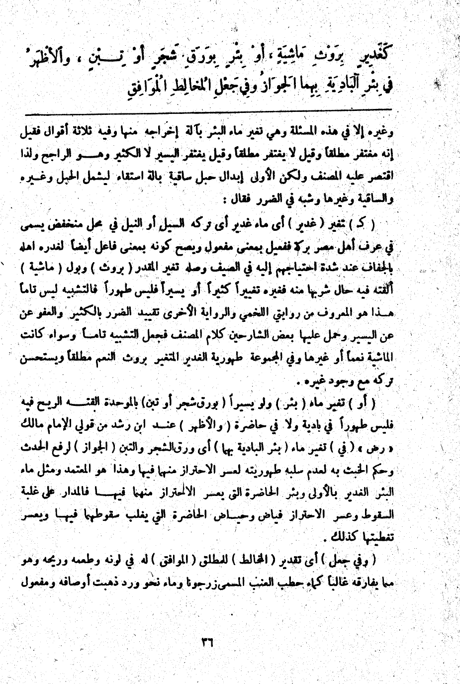 (وَالْأَظْهَرُ) عِنْدَ ابْنِ رُشْدٍ مِنْ قَوْلَيْ الْإِمَامِ مَالِكٍ " - رَضِيَ اللَّهُ عَنْهُ - " (فِي) تَغَيُّرِ مَاءِ (بِئْرِ الْبَادِيَةِ بِهِمَا) أَيْ وَرَقِ الشَّجَرِ وَالتِّبْنِ (الْجَوَازُ) لِرَفْعِ الْحَدَثِ، وَحُكْمِ الْخَبَثِ بِهِ لِعَدَمِ سَلْبِهِ طَهُورِيَّتَهُ لِعُسْرِ الِاحْتِرَازِ مِنْهُمَا فِيهَا وَهَذَا هُوَ الْمُعْتَمَدُ وَمِثْلُ مَاءِ الْبِئْرِ الْغَدِيرُ بِالْأَوْلَى وَبِئْرُ الْحَاضِرَةِ الَّتِي يَعْسُرُ الِاحْتِرَازُ مِنْهُمَا فِيهَا فَالْمَدَارُ عَلَى غَلَبَةِ السُّقُوطِ، وَعُسْرِ الِاحْتِرَازِ فِيَاضُ وَحِيَاضُ الْحَاضِرَةِ الَّتِي يَغْلِبُ سُقُوطُهُمَا فِيهَا وَيَعْسُرُ تَغْطِيَتُهَا كَذَلِكَ.