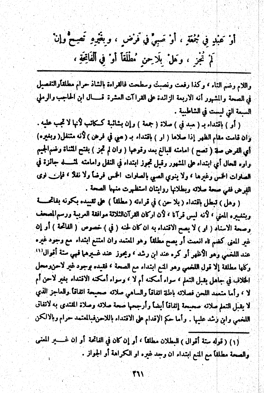 (وَهَلْ) تَبْطُلُ بِاقْتِدَاءٍ (بِلَاحِنٍ) فِي قِرَاءَتِهِ (مُطْلَقًا) عَلَى تَقْيِيدِهِ بِكَوْنِهِ بِفَاتِحَةٍ وَبِتَغْيِيرِهِ الْمَعْنَى لِأَنَّهُ لَيْسَ قُرْآنًا لِأَنَّ أَرْكَانَ الْقُرْآنِ الثَّلَاثَةَ مُوَافَقَةُ الْعَرَبِيَّةَ وَرَسْمُ الْمُصْحَفِ وَصِحَّةُ الْإِسْنَادِ (أَوْ) لَا يَصِحُّ الِاقْتِدَاءُ بِهِ إنْ كَانَ لَحْنُهُ (فِي) خُصُوصِ (الْفَاتِحَةِ) أَوْ إنْ غَيَّرَ الْمَعْنَى كَضَمِّ تَاءِ أَنْعَمْت أَوْ يَصِحُّ مُطْلَقًا وَهُوَ الْمُعْتَمَدُ وَإِنْ امْتَنَعَ ابْتِدَاءً مَعَ وُجُودِ غَيْرِهِ عِنْدَ اللَّخْمِيِّ وَهُوَ الْأَظْهَرُ أَوْ كُرِهَ عِنْدَ ابْنِ رُشْدٍ، وَيَجُوزُ عِنْدَ غَيْرِهِمَا فَهِيَ سِتَّةُ أَقْوَالٍ وَكُلُّهَا مُطْلَقَةٌ إلَّا قَوْلَ اللَّخْمِيِّ وَهُوَ الْمَنْعُ ابْتِدَاءً مَعَ الصِّحَّةِ، فَقَيَّدَهُ بِوُجُودِ غَيْرِ لَاحِنٍ، وَمَحَلُّ الْخِلَافِ فِي جَاهِلٍ يَقْبَلُ التَّعَلُّمَ سَوَاءٌ أَمْكَنَهُ أَمْ لَا، وَسَوَاءٌ أَمْكَنَهُ الِاقْتِدَاءُ بِغَيْرِ لَاحِنٍ أَمْ لَا، وَأَمَّا مُتَعَمِّدُ اللَّحْنِ فَصَلَاتُهُ بَاطِلَةٌ اتِّفَاقًا وَالسَّاهِي صَلَاتُهُ صَحِيحَةٌ اتِّفَاقًا وَالْعَاجِزُ الَّذِي لَا يَقْبَلُ التَّعَلُّمَ صَلَاتُهُ صَحِيحَةٌ اتِّفَاقًا أَيْضًا وَأَرْجَحُهَا صِحَّةُ صَلَاتِهِ وَصَلَاةُ الْمُقْتَدِي بِهِ لِاتِّفَاقِ اللَّخْمِيِّ وَابْنِ رُشْدٍ عَلَيْهَا.