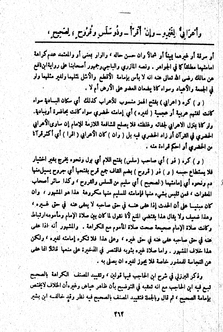 (وَ) كُرِهَ (أَعْرَابِيٌّ) بِفَتْحِ الْهَمْزِ مَنْسُوبٌ لِلْأَعْرَابِ كَذَلِكَ أَيْ سُكَّانِ الْبَادِيَةِ سَوَاءٌ كَانَتْ لُغَتُهُمْ عَرَبِيَّةً أَوْ عَجَمِيَّةً (لِغَيْرِهِ) أَيْ إمَامَتُهُ لِحَضَرِيٍّ سَوَاءٌ كَانَتْ بِحَاضِرَةٍ أَوْ بِبَادِيَةٍ. وَلَوْ كَانَا بِمَنْزِلِ الْأَعْرَابِيِّ لِجَفَائِهِ وَغِلْظَتِهِ فَلَا يَصْلُحُ لِلشَّفَاعَةِ اللَّازِمَةِ لِلْإِمَامِ إنْ سَاوَى الْأَعْرَابِيُّ الْحَضَرِيَّ فِي الْقُرْآنِ أَوْ زَادَ الْحَضَرِيُّ فِيهِ بَلْ (وَإِنْ) كَانَ الْأَعْرَابِيُّ (أَقْرَأَ) أَيْ أَكْثَرَ قُرْآنًا مِنْ الْحَضَرِيِّ أَوْ أَحْكَمَ قِرَاءَةً مِنْهُ.