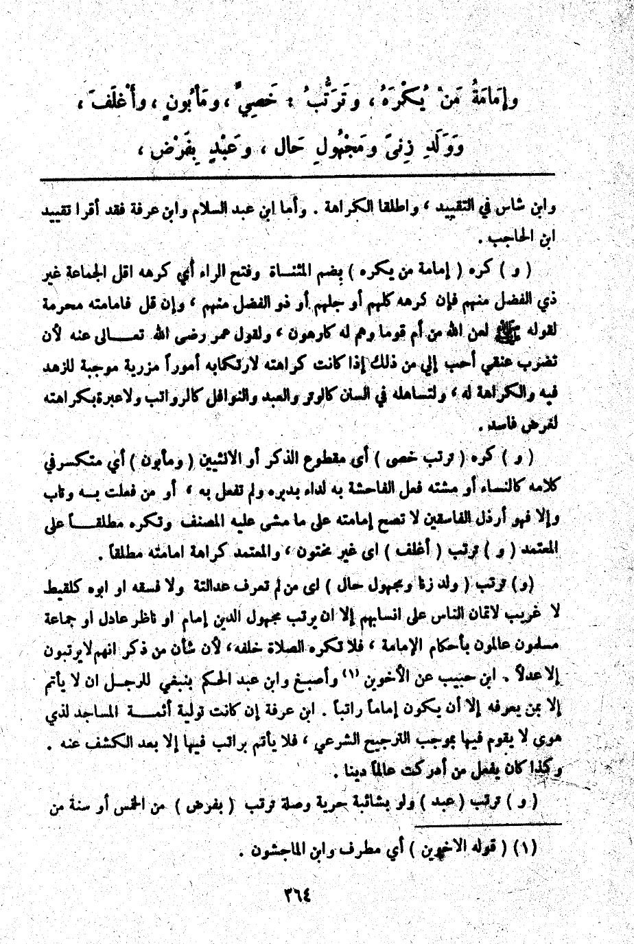 (وَ) كُرِهَ (تَرَتُّبُ خَصِيٍّ) أَيْ مَقْطُوعِ الذَّكَرِ أَوْ الْأُنْثَيَيْنِ (وَمَأْبُونٍ) أَيْ مُتَكَسِّرٍ فِي كَلَامِهِ كَالنِّسَاءِ أَوْ مُشْتَهٍ فِعْل الْفَاحِشَةَ بِهِ لِدَاءٍ بِدُبُرِهِ وَلَمْ تُفْعَلْ بِهِ، أَوْ مَنْ فُعِلَتْ بِهِ وَتَابَ وَإِلَّا فَهُوَ أَرْذَلُ الْفَاسِقِينَ لَا تَصِحُّ إمَامَتُهُ عَلَى مَا مَشَى عَلَيْهِ الْمُصَنِّفُ وَتُكْرَهُ مُطْلَقًا عَلَى الْمُعْتَمَدِ (وَ) تَرَتُّبُ (أَغْلَفَ) أَيْ غَيْرِ مَخْتُونٍ وَالْمُعْتَمَدُ كَرَاهَةُ إمَامَتِهِ مُطْلَقًا.
