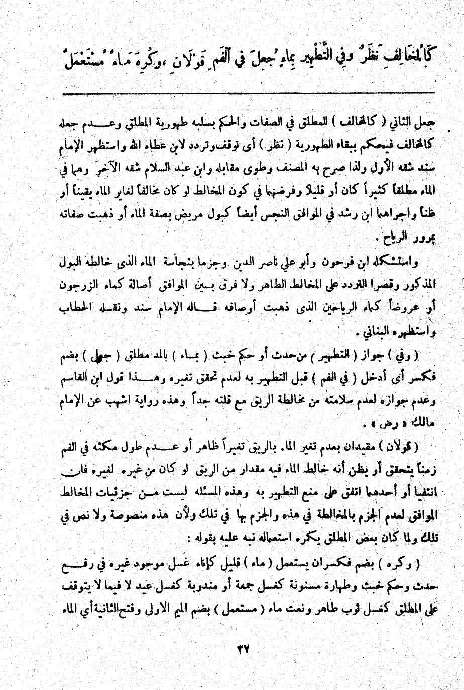 وَاسْتَشْكَلَهُ ابْنُ فَرْحُونٍ وَأَبُو عَلِيٍّ نَاصِرُ الدِّينِ وَجَزَمَا بِنَجَاسَةِ الْمَاءِ الَّذِي خَالَطَهُ الْبَوْلُ الْمَذْكُورُ وَقَصَرَا التَّرَدُّدَ عَلَى الْمُخَالِطِ الطَّاهِرِ وَلَا فَرْقَ بَيْنَ الْمُوَافِقِ أَصَالَةً كَمَاءِ الزَّرْجُونِ، أَوْ عُرُوضًا كَمَاءِ الرَّيَاحِينِ الَّذِي ذَهَبَتْ أَوْصَافُهُ قَالَهُ الْإِمَامُ سَنَدٌ وَنَقَلَهُ الْحَطَّابُ وَاسْتَظْهَرَهُ الْبُنَانِيُّ.
