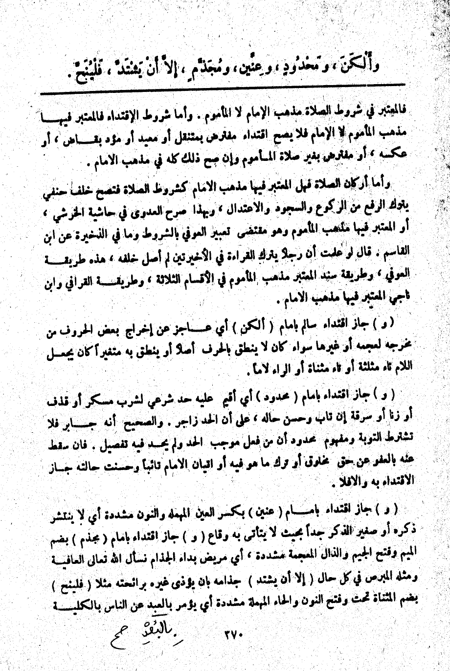 ـــــــــــــــــــــــــــــQفَالْمُعْتَبَرُ فِي شُرُوطِ الصَّلَاةِ مَذْهَبُ الْإِمَامِ لَا الْمَأْمُومِ. وَأَمَّا شُرُوطُ الِاقْتِدَاءِ فَالْمُعْتَبَرُ فِيهَا مَذْهَبُ الْمَأْمُومِ لَا الْإِمَامِ فَلَا يَصِحُّ اقْتِدَاءُ مُفْتَرِضٍ بِمُتَنَقِّلٍ أَوْ مُعِيدٍ أَوْ مُؤَدٍّ بِقَاضٍ، أَوْ عَكْسِهِ، أَوْ مُفْتَرِضٍ بِغَيْرِ صَلَاةِ الْمَأْمُومِ وَإِنْ صَحَّ ذَلِكَ كُلُّهُ فِي مَذْهَبِ الْإِمَامِ. وَأَمَّا أَرْكَانُ الصَّلَاةِ فَهَلْ الْمُعْتَبَرُ فِيهَا مَذْهَبُ الْإِمَامِ كَشُرُوطِ الصَّلَاةِ فَتَصِحُّ خَلْفَ حَنَفِيٍّ يَتْرُكُ الرَّفْعَ مِنْ الرُّكُوعِ وَالسُّجُودِ وَالِاعْتِدَالَ، وَبِهَذَا صَرَّحَ الْعَدَوِيُّ فِي حَاشِيَةِ الْخَرَشِيِّ، أَوْ الْمُعْتَبَرُ فِيهَا مَذْهَبُ الْمَأْمُومِ وَهُوَ مُقْتَضَى تَعْبِيرِ الْعَوْفِيِّ بِالشُّرُوطِ وَمَا فِي الذَّخِيرَةِ عَنْ ابْنِ الْقَاسِمِ. قَالَ لَوْ عَلِمْت أَنَّ رَجُلًا يَتْرُكُ الْقِرَاءَةَ فِي الْأَخِيرَتَيْنِ لَمْ أُصَلِّ خَلْفَهُ، هَذِهِ طَرِيقَةُ الْعَوْفِيِّ، وَطَرِيقَةُ سَنَدٍ الْمُعْتَبَرُ مَذْهَبُ الْمَأْمُومِ فِي الْأَقْسَامِ الثَّلَاثَةِ، وَطَرِيقَةُ الْقَرَافِيِّ وَابْنِ نَاجِي الْمُعْتَبَرُ فِيهَا مَذْهَبُ الْإِمَامِ.