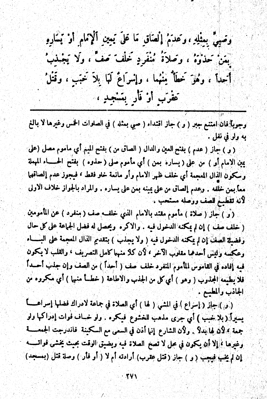 (وَ) جَازَ (صَلَاةُ) مَأْمُومٍ مُقْتَدٍ بِالْإِمَامِ الَّذِي خَلْفَهُ صَفٌّ (مُنْفَرِدٍ) عَنْ الْمَأْمُومِينَ (خَلْفَ صَفٍّ) إنْ لَمْ يُمْكِنْهُ الدُّخُولُ فِيهِ. وَإِلَّا كُرِهَ وَيَحْصُلُ لَهُ فَضْلُ الْجَمَاعَةِ عَلَى كُلِّ حَالٍ وَفَضِيلَةُ الصَّفِّ إنْ لَمْ يُمْكِنْهُ الدُّخُولُ فِيهِ (وَلَا يَجْذِبُ) بِتَقْدِيمِ الذَّالِ الْمُعْجَمَةِ عَلَى الْبَاءِ وَعَكْسُهُ وَلَيْسَ أَحَدُهُمَا مَقْلُوبَ الْآخَرِ لِأَنَّ كُلًّا مِنْهُمَا كَامِلُ التَّصْرِيفِ، وَالْقَلْبُ لَا يَكُونُ فِيهِ، أَفَادَهُ فِي الْقَامُوسِ الْمَأْمُوم الْمُنْفَرِدُ خَلْفَ صَفٍّ (أَحَدًا) مِنْ الصَّفِّ وَإِنْ جَذَبَ أَحَدًا فَلَا يُطِيعُهُ الْمَجْذُوبُ (وَهُوَ) أَيْ كُلٌّ مِنْ الْجَذْبِ وَالْإِطَاعَةِ (خَطَأٌ مِنْهُمَا) أَيْ مَكْرُوهٌ مِنْ الْجَاذِبِ وَالْمُطِيعِ.