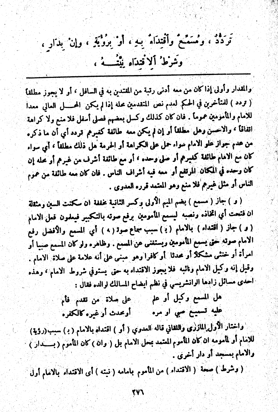 ـــــــــــــــــــــــــــــQوَالْمِقْدَارِ وَأَوْلَى إذَا كَانَ مَنْ مَعَهُ أَدْنَى رُتْبَةً مِنْ الْمُقْتَدِينَ بِهِ فِي السَّافِلِ، أَوْ لَا يَجُوزُ مُطْلَقًا (تَرَدُّدٌ) لِلْمُتَأَخِّرِينَ فِي الْحُكْمِ لِعَدَمِ نَصِّ الْمُتَقَدِّمِينَ مَحَلُّهُ إذَا لَمْ يَكُنْ الْمَحَلُّ الْعَالِي مُعَدًّا لِلْإِمَامِ وَالْمَأْمُومِينَ عُمُومًا. فَإِنْ كَانَ كَذَلِكَ وَكَسِلَ بَعْضُهُمْ فَصَلَّى أَسْفَلَ فَلَا مَنْعَ وَلَا كَرَاهَةَ اتِّفَاقًا، وَالْأَحْسَنُ وَهَلْ مُطْلَقًا أَوْ إنْ لَمْ يَكُنْ مَعَهُ طَائِفَةٌ كَغَيْرِهِمْ تَرَدُّدٌ أَيْ أَنَّ مَا ذَكَرَهُ مِنْ عَدَمِ جَوَازِ عُلُوِّ الْإِمَامِ سَوَاءٌ حُمِلَ عَلَى الْكَرَاهَةِ أَوْ الْحُرْمَةِ هَلْ ذَلِكَ مُطْلَقًا، أَيْ سَوَاءٌ كَانَ مَعَ الْإِمَامِ طَائِفَةٌ كَغَيْرِهِمْ أَوْ صَلَّى وَحْدَهُ، أَوْ مَعَ طَائِفَةٍ أَشْرَفَ مِنْ غَيْرِهِمْ أَوْ مَحَلُّهُ إنْ كَانَ وَحْدَهُ فِي الْمَكَانِ الْمُرْتَفِعِ أَوْ مَعَهُ فِيهِ أَشْرَافُ النَّاسِ. فَإِنْ كَانَ مَعَهُ طَائِفَةٌ مِنْ عُمُومِ النَّاسِ أَوْ مِثْلَ غَيْرِهِمْ فَلَا مَنْعَ وَهُوَ الْمُعْتَمَدُ قَرَّرَهُ الْعَدَوِيُّ.