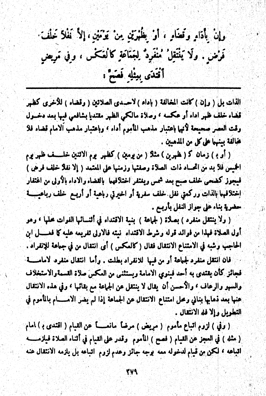ـــــــــــــــــــــــــــــQالذَّاتِ بَلْ (وَإِنْ) كَانَتْ الْمُخَالَفَةُ (بِأَدَاءٍ) لِإِحْدَى الصَّلَاتَيْنِ (وَقَضَاءٍ) لِلْأُخْرَى كَظُهْرٍ قَضَاءً خَلْفَ ظُهْرٍ أَدَاءً أَوْ عَكْسِهِ وَصَلَاةُ مَالِكِيٍّ الظُّهْرَ مُقْتَدِيًا بِشَافِعِيٍّ فِيهَا بَعْدَ دُخُولِ وَقْتِ الْعَصْرِ صَحِيحَةٌ لِأَنَّهُمَا بِاعْتِبَارِ مَذْهَبِ الْمَأْمُومِ أَدَاءٌ، وَبِاعْتِبَارِ مَذْهَبِ الْإِمَامِ قَضَاءٌ فَلَا مُخَالَفَةَ بَيْنَهُمَا عَلَى كُلٍّ مِنْ الْمَذْهَبَيْنِ. (أَوْ بِ) زَمَانٍ كَ (ظُهْرَيْنِ) مَثَلًا (مِنْ يَوْمَيْنِ) كَظُهْرِ يَوْمِ الِاثْنَيْنِ خَلْفَ ظُهْرِ يَوْمِ الْخَمِيسِ فَلَا بُدَّ مِنْ اتِّحَادِ ذَاتِ الصَّلَاةِ وَصِفَتِهَا وَزَمَنِهَا عَلَى الْمُعْتَمَدِ (إلَّا نَفْلًا خَلْفَ فَرْضٍ) فَيَجُوزُ كَضُحًى خَلْفَ صُبْحٍ بَعْدَ شَمْسٍ وَيُغْتَفَرُ اخْتِلَافُهُمَا بِالْقَضَاءِ وَالْأَدَاءِ بِالْأَوْلَى مِنْ اغْتِفَارِ اخْتِلَافِهِمَا بِالذَّاتِ وَرَكْعَتَيْ نَفْلٍ خَلْفَ سَفَرِيَّةٍ أَوْ أَخِيرَتَيْ رُبَاعِيَّةٍ أَوْ أَرْبَعٍ خَلْفَ رُبَاعِيَّةٍ حَضَرِيَّةٍ بِنَاءً عَلَى جَوَازِ النَّفْلِ بِأَرْبَعٍ.