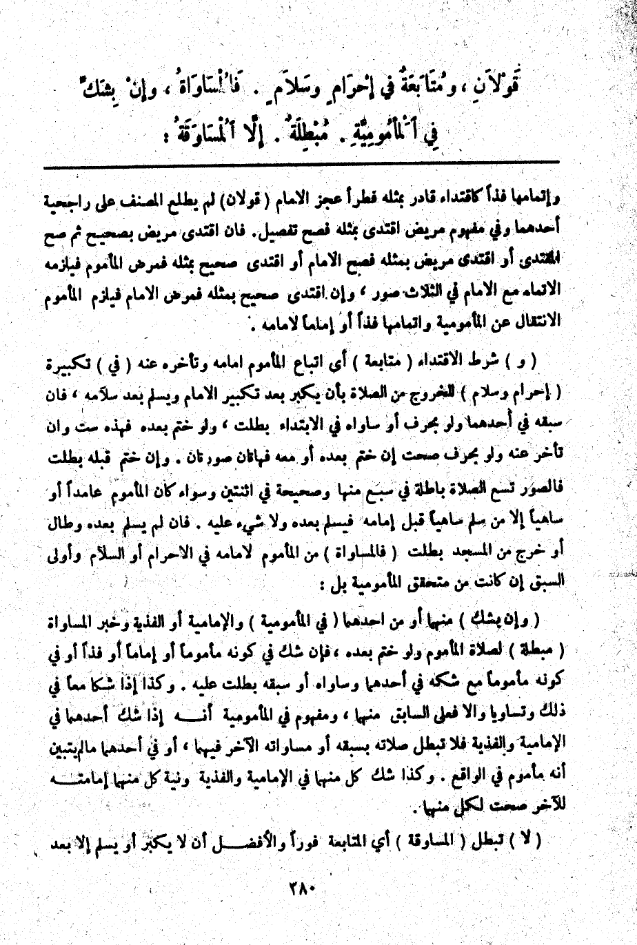 وَمُتَابَعَةٌ فِي إحْرَامٍ وَسَلَامٍ. فَالْمُسَاوَاةُ، وَإِنْ بِشَكٍّ فِي الْمَأْمُومِيَّةِ، مُبْطِلَةٌ. إلَّا الْمُسَاوَقَةُ: