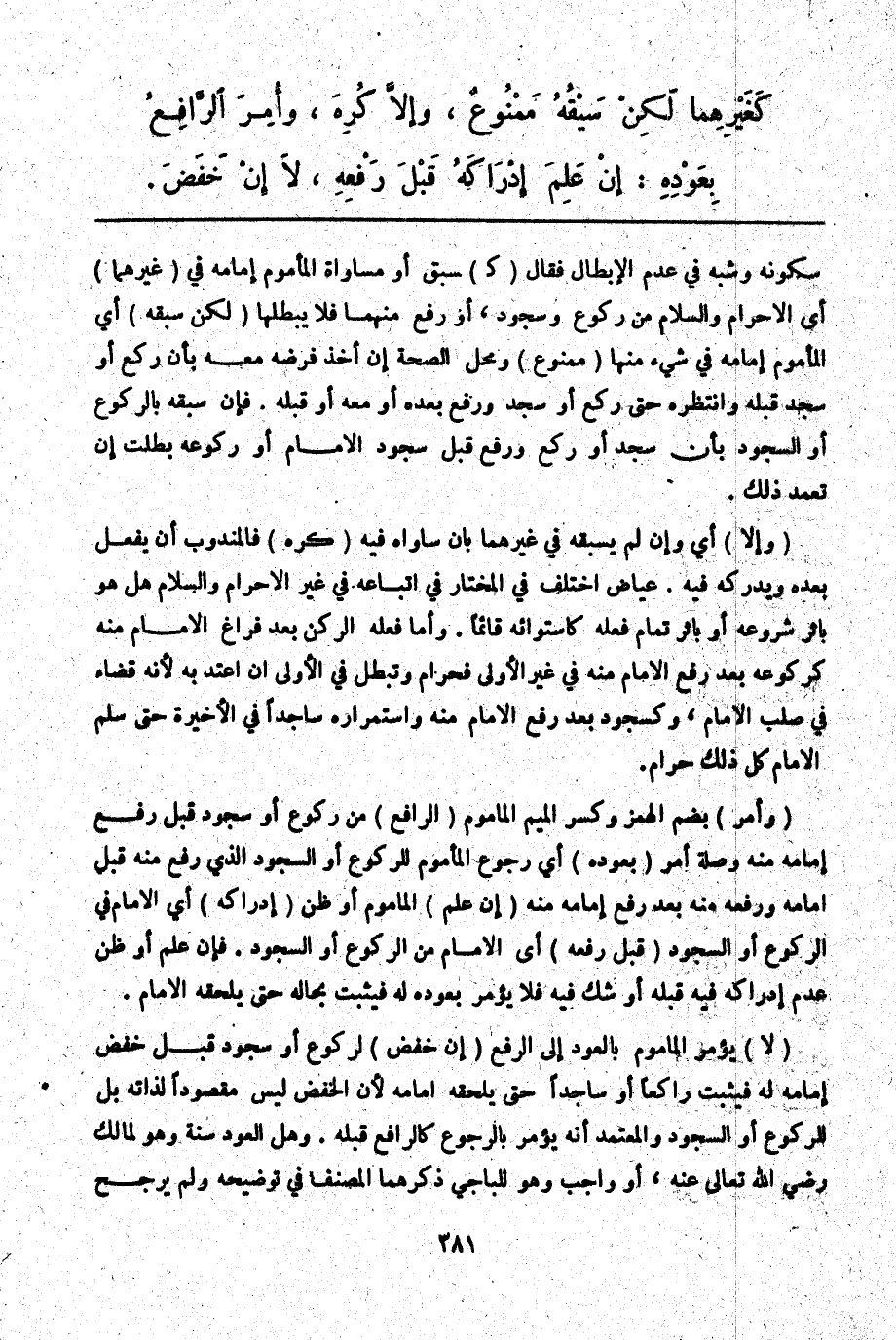 ـــــــــــــــــــــــــــــQسُكُونِهِ وَشَبَّهَ فِي عَدَمِ الْإِبْطَالِ فَقَالَ (كَ) سَبْقِ أَوْ مُسَاوَاةِ الْمَأْمُومِ إمَامَهُ فِي (غَيْرِهِمَا) أَيْ الْإِحْرَامِ وَالسَّلَامِ مِنْ رُكُوعٍ وَسُجُودِهِ، أَوْ رَفْعٍ مِنْهُمَا فَلَا يُبْطِلُهَا (لَكِنْ سَبْقُهُ) أَيْ الْمَأْمُومِ إمَامَهُ فِي شَيْءٍ مِنْهَا (مَمْنُوعٌ) وَمَحَلُّ الصِّحَّةِ إنْ أَخَذَ فَرْضَهُ مَعَهُ بِأَنْ رَكَعَ أَوْ سَجَدَ قَبْلَهُ وَانْتَظَرَهُ حَتَّى رَكَعَ أَوْ سَجَدَ وَرَفَعَ بَعْدَهُ أَوْ مَعَهُ أَوْ قَبْلَهُ.