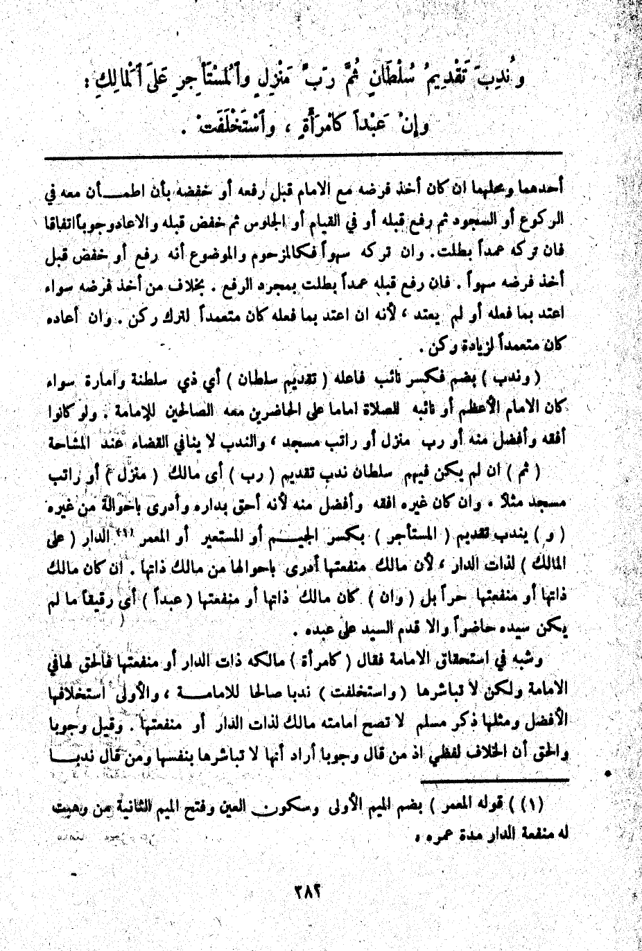 (وَنُدِبَ) بِضَمٍّ فَكَسْرٍ نَائِبُ فَاعِلِهِ (تَقْدِيمُ سُلْطَانٍ) أَيْ ذِي سَلْطَنَةٍ وَإِمَارَةٍ سَوَاءٌ كَانَ الْإِمَامَ الْأَعْظَمَ أَوْ نَائِبَهُ لِلصَّلَاةِ إمَامًا عَلَى الْحَاضِرِينَ مَعَهُ الصَّالِحِينَ لِلْإِمَامَةِ. وَلَوْ كَانُوا أَفْقَهَ وَأَفْضَلَ مِنْهُ أَوْ رَبَّ مَنْزِلٍ أَوْ رَاتِبَ مَسْجِدٍ، وَالنَّدْبُ لَا يُنَافِي الْقَضَاءَ عِنْدَ الْمُشَاحَّةِ (ثُمَّ) إنْ لَمْ يَكُنْ فِيهِمْ سُلْطَانٌ نُدِبَ تَقْدِيمُ (رَبِّ) أَيْ مَالِكِ (مَنْزِلٍ) أَوْ رَاتِبِ مَسْجِدٍ مَثَلًا. وَإِنْ كَانَ غَيْرُهُ أَفْقَهَ وَأَفْضَلَ مِنْهُ لِأَنَّهُ أَحَقُّ بِدَارِهِ وَأَدْرَى بِأَحْوَالِهِ مِنْ غَيْرِهِ (وَ) يُنْدَبُ تَقْدِيمُ (الْمُسْتَأْجِرِ) بِكَسْرِ الْجِيمِ أَوْ الْمُسْتَعِيرِ أَوْ الْمُعْمِرِ الدَّارَ (عَلَى الْمَالِكِ) لِذَاتِ الدَّارِ لِأَنَّ مَالِكَ مَنْفَعَتِهَا أَدْرَى بِأَحْوَالِهَا مِنْ مَالِكِ ذَاتِهَا. إنْ كَانَ مَالِكُ ذَاتِهَا أَوْ مَنْفَعَتِهَا حُرًّا بَلْ (وَإِنْ) كَانَ مَالِكُ ذَاتِهَا أَوْ مَنْفَعَتِهَا (عَبْدًا) أَيْ رَقِيقًا مَا لَمْ يَكُنْ سَيِّدُهُ حَاضِرًا وَإِلَّا قُدِّمَ السَّيِّدُ عَلَى عَبْدِهِ. وَشَبَّهَ فِي اسْتِحْقَاقِ الْإِمَامَةِ فَقَالَ (كَامْرَأَةٍ) مَالِكَةٍ ذَاتَ الدَّارِ أَوْ مَنْفَعَتَهَا فَالْحَقُّ لَهَا فِي الْإِمَامَةِ وَلَكِنْ لَا تُبَاشِرُهَا (وَاسْتَخْلَفَتْ) نَدْبًا صَالِحًا لِلْإِمَامَةِ، وَالْأَوْلَى اسْتِخْلَافُهَا الْأَفْضَلَ وَمِثْلُهَا ذَكَرَ مُسْلِمٌ لَا تَصِحُّ إمَامَةُ مَالِكٍ لِذَاتِ الدَّارِ أَوْ مَنْفَعَتِهَا.
