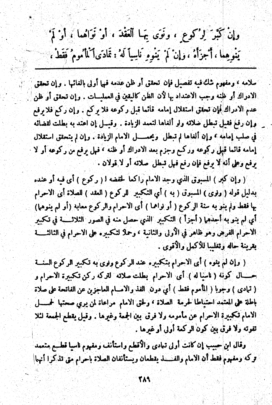 (وَإِنْ كَبَّرَ) الْمَسْبُوقُ الَّذِي وَجَدَ الْإِمَامَ رَاكِعًا لِخَفْضِهِ لِ (رُكُوعٍ) أَيْ فِيهِ أَوْ عِنْدَهُ بِدَلِيلِ قَوْلِهِ (وَنَوَى) الْمَسْبُوقُ (بِهِ) أَيْ التَّكْبِيرِ لِلرُّكُوعِ (الْعَقْدَ) لِلصَّلَاةِ أَيْ الْإِحْرَامِ بِهَا فَقَطْ وَلَمْ يَنْوِ بِهِ سُنَّةَ الرُّكُوعِ (أَوْ نَوَاهُمَا) أَيْ الْإِحْرَامَ وَالرُّكُوعَ مَعًا بِهِ (أَوْ لَمْ يَنْوِهِمَا) أَيْ لَمْ يَنْوِ بِهِ أَحَدَهُمَا (أَجْزَأَ) التَّكْبِيرُ الَّذِي حَصَلَ مِنْهُ فِي الصُّوَرِ الثَّلَاثَةِ فِي تَكْبِيرِ الْإِحْرَامِ الْفَرْضِ وَهُوَ ظَاهِرٌ فِي الْأُولَى وَالثَّانِيَةِ، وَحَمْلًا لِتَكْبِيرِهِ عَلَى الْإِحْرَامِ فِي الثَّالِثَةِ بِقَرِينَةِ حَالِهِ وَتَغْلِيبًا لِلْأَكْمَلِ وَالْأَقْوَى. (وَإِنْ لَمْ يَنْوِهِ) أَيْ الْإِحْرَامَ بِتَكْبِيرِهِ عِنْدَ الرُّكُوعِ وَنَوَى بِهِ تَكْبِيرَ الرُّكُوعِ السُّنَّةَ حَالَ كَوْنِهِ (نَاسِيًا لَهُ) أَيْ الْإِحْرَامِ بَطَلَتْ صَلَاتُهُ لِتَرْكِهِ رُكْنَ تَكْبِيرَةِ الْإِحْرَامِ وَ (تَمَادَى) وُجُوبًا (الْمَأْمُومُ فَقَطْ) أَيْ دُونَ الْفَذِّ وَالْإِمَامِ الْعَاجِزَيْنِ عَنْ الْفَاتِحَةِ عَلَى صَلَاةٍ بَاطِلَةٍ عَلَى الْمُعْتَمَدِ احْتِيَاطًا لِحُرْمَةِ الصَّلَاةِ، وَلَحِقَ الْإِمَامَ مُرَاعَاةً لِمَنْ يَرَى صِحَّتَهَا لِحَمْلِ الْإِمَامِ تَكْبِيرَةَ الْإِحْرَامِ عَنْ مَأْمُومِهِ وَلَا فَرْقَ بَيْنَ الْجُمُعَةِ وَغَيْرِهَا.