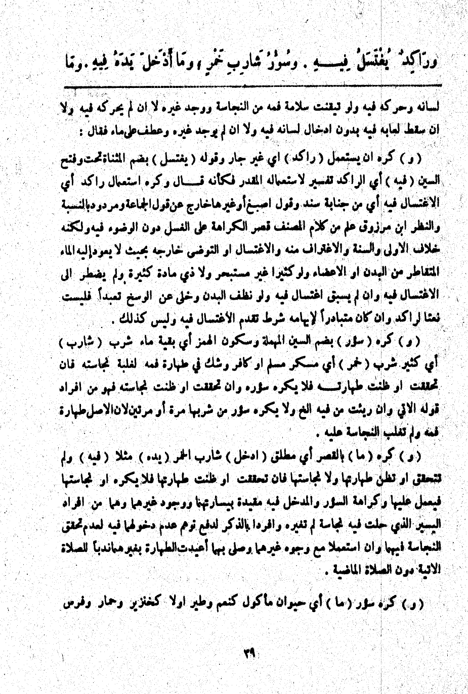 ـــــــــــــــــــــــــــــQلِسَانَهُ وَحَرَّكَهُ فِيهِ وَلَوْ تُيُقِّنَتْ سَلَامَةُ فَمِهِ مِنْ النَّجَاسَةِ وَوُجِدَ غَيْرُهُ لَا إنْ لَمْ يُحَرِّكْهُ فِيهِ وَلَا إنْ سَقَطَ لُعَابُهُ فِيهِ بِدُونِ إدْخَالِ لِسَانِهِ فِيهِ وَلَا إنْ لَمْ يُوجَدْ غَيْرُهُ عَطَفَ عَلَى " مَاءٌ " فَقَالَ: (وَ) كُرِهَ أَنْ يُسْتَعْمَلَ (رَاكِدٌ) أَيْ غَيْرُ جَارٍ، وَقَوْلُهُ (يُغْتَسَلُ) بِضَمِّ الْمُثَنَّاةِ تَحْتُ وَفَتْحِ السِّينِ (فِيهِ) أَيْ الرَّاكِدِ تَفْسِيرٌ لِاسْتِعْمَالِهِ الْمُقَدَّرِ فَكَأَنَّهُ قَالَ وَكُرِهَ اسْتِعْمَالُ رَاكِدٍ أَيْ الِاغْتِسَالُ فِيهِ أَيْ مِنْ جَنَابَةٍ سَنَدٌ، وَقَوْلُ أَصْبَغَ " أَوْ غَيْرِهَا " خَارِجٌ عَنْ قَوْلِ الْجَمَاعَةِ وَمَرْدُودٌ بِالنِّسْبَةِ وَالنَّظَرِ ابْنُ مَرْزُوقٍ عُلِمَ مِنْ كَلَامِ الْمُصَنِّفِ قَصْرُ الْكَرَاهَةِ عَلَى الْغُسْلِ دُونَ الْوُضُوءِ فِيهِ وَلَكِنَّهُ خِلَافُ الْأَوْلَى، وَالسُّنَّةُ الِاغْتِرَافُ مِنْهُ وَالِاغْتِسَالُ أَوْ التَّوَضُّؤُ خَارِجَهُ بِحَيْثُ لَا يَعُودُ إلَيْهِ الْمَاءُ الْمُتَقَاطِرُ مِنْ الْبَدَنِ، أَوْ الْأَعْضَاءِ وَلَوْ كَثِيرًا غَيْرَ مُسْتَبْحِرٍ وَلَا ذِي مَادَّةٍ كَثِيرَةٍ وَلَمْ يُضْطَرَّ إلَى الِاغْتِسَالِ فِيهِ، وَإِنْ لَمْ يَسْبِقْ اغْتِسَالٌ فِيهِ وَلَوْ نُظِّفَ الْبَدَنُ وَخَلَا عَنْ الْوَسَخِ تَعَبُّدًا فَلَيْسَتْ نَعْتًا لِرَاكِدٍ، وَإِنْ كَانَ مُتَبَادَرًا لِإِيهَامِهِ شَرْطَ تَقَدُّمِ الِاغْتِسَالِ فِيهِ وَلَيْسَ كَذَلِكَ.