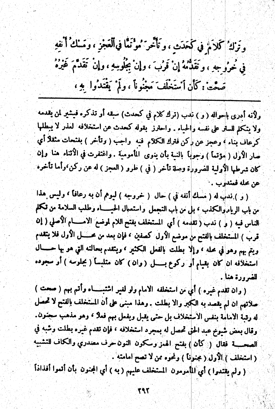 ـــــــــــــــــــــــــــــQوَلِأَنَّهُ أَدْرَى بِأَحْوَالِهِ (وَ) نُدِبَ (تَرْكُ كَلَامٍ فِي كَحَدَثٍ) سَبَقَهُ أَوْ تَذَكَّرَهُ فَيُشِيرُ لِمَنْ يُقَدِّمُهُ وَلَا يَتَكَلَّمُ لِلسَّتْرِ عَلَى نَفْسِهِ وَالْحَيَاءِ. وَاحْتَرَزَ بِقَوْلِهِ كَحَدَثٍ عَنْ اسْتِخْلَافِهِ لِعُذْرٍ لَا يُبْطِلُهَا كَرُعَافِ بِنَاءٍ، وَعَجْزٍ عَنْ رُكْنٍ فَتَرْكُ الْكَلَامِ فِيهِ وَاجِبٌ (وَتَأَخَّرَ) بِفَتَحَاتٍ مُثَقَّلًا أَيْ صَارَ الْأَوَّلُ (مُؤْتَمًّا) وُجُوبًا بِالنِّيَّةِ بِأَنْ يَنْوِيَ الْمَأْمُومِيَّةَ. وَاغْتُفِرَتْ فِي الْأَثْنَاءِ هُنَا وَإِنْ كَانَ شَرْطُهَا الْأَوَّلِيَّةَ لِلضَّرُورَةِ وَصِلَةُ تَأَخَّرَ (فِي) طُرُوُّ (الْعَجْزِ) لَهُ عَنْ رُكْنٍ، وَأَمَّا تَأَخُّرُهُ عَنْ مَحَلِّهِ فَمَنْدُوبٌ.