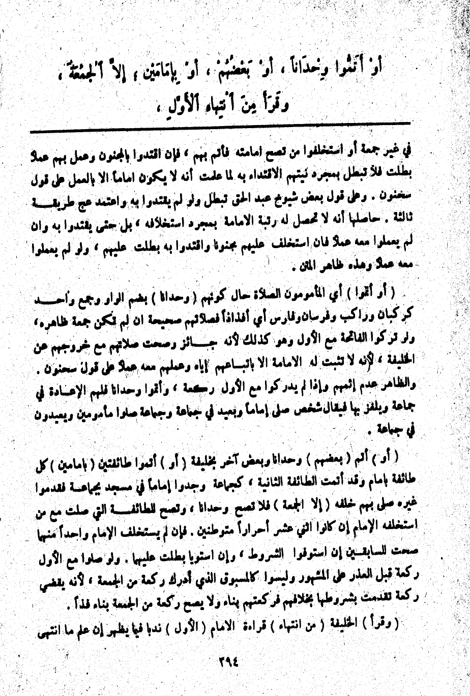 (أَوْ أَتَمُّوا) أَيْ الْمَأْمُومُونَ الصَّلَاةَ حَالَ كَوْنِهِمْ (وُحْدَانًا) بِضَمِّ الْوَاوِ جَمْعُ وَاحِدٍ كَرُكْبَانٍ وَرَاكِبٍ وَفُرْسَانٍ وَفَارِسٍ أَيْ أَفْذَاذًا فَصَلَاتُهُمْ صَحِيحَةٌ إنْ لَمْ تَكُنْ جُمُعَةً ظَاهِرَةً، وَلَوْ تَرَكُوا الْفَاتِحَةَ مَعَ الْأَوَّلِ، وَهُوَ كَذَلِكَ؛ لِأَنَّهُ جَائِزٌ وَصَحَّتْ صَلَاتُهُمْ مَعَ خُرُوجِهِمْ عَنْ الْخَلِيفَةِ،؛ لِأَنَّهُ لَا تَثْبُتُ لَهُ الْإِمَامَةُ إلَّا بِاتِّبَاعِهِمْ إيَّاهُ وَعَمَلِهِمْ مَعَهُ عَمَلًا عَلَى قَوْلِ سَحْنُونٍ. وَالظَّاهِرُ عَدَمُ إثْمِهِمْ، وَإِذَا لَمْ يُدْرِكُوا مَعَ الْأَوَّلِ رَكْعَةً، وَأَتَمُّوا وُحْدَانًا فَلَهُمْ الْإِعَادَةُ فِي جَمَاعَةٍ وَيُلْغَزُ بِهَا فَيُقَالُ شَخْصٌ صَلَّى إمَامًا وَيُعِيدُ فِي جَمَاعَةٍ وَجَمَاعَةٌ صَلَّوْا مَأْمُومِينَ وَيُعِيدُونَ فِي جَمَاعَةٍ.