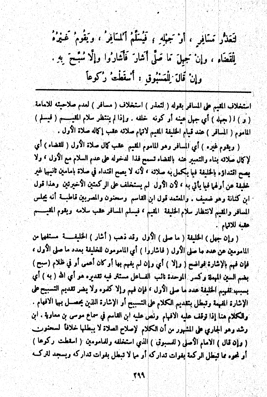 ـــــــــــــــــــــــــــــQاسْتِخْلَافَ الْمُقِيمِ عَلَى الْمُسَافِرِ بِقَوْلِهِ (لِتَعَذُّرِ) اسْتِخْلَافِ (مُسَافِرٍ) لِعَدَمِ صَلَاحِيَّتِهِ لِلْإِمَامَةِ (وَ) لِ (لِجَهْلِهِ) أَيْ جَهْلِ عَيْنِهِ أَوْ كَوْنِهِ خَلْفَهُ. وَإِذَا لَمْ يَنْتَظِرْ سَلَامَ الْمُقِيمِ (فَيُسَلِّمُ) الْمَأْمُومُ (الْمُسَافِرُ) عِنْدَ قِيَامِ الْخَلِيفَةِ الْمُقِيمِ لِإِتْمَامِ صَلَاتِهِ عَقِبَ إكْمَالِهِ صَلَاةَ الْأَوَّلِ. (وَيَقُومُ غَيْرُهُ) أَيْ الْمُسَافِرِ، وَهُوَ الْمَأْمُومُ الْمُقِيمُ عَقِبَ كَمَالِ صَلَاةِ الْأَوَّلِ (لِلْقَضَاءِ) أَيْ لِإِكْمَالِ صَلَاتِهِ بِنَاءً وَالتَّعْبِيرُ عَنْهُ بِالْقَضَاءِ تَسَمُّحٌ فَذًّا لِدُخُولِهِ عَلَى عَدَمِ السَّلَامِ مَعَ الْأَوَّلِ، وَلَا يَصِحُّ اقْتِدَاؤُهُ بِالْخَلِيفَةِ فِيمَا يُكْمِلُ بِهِ صَلَاتَهُ؛ لِأَنَّهُ لَا يَصِحُّ اقْتِدَاءٌ فِي صَلَاةٍ بِإِمَامَيْنِ ثَانِيهِمَا غَيْرُ خَلِيفَةٍ عَنْ أَوَّلِهِمَا فِيمَا يَأْتِي بِهِ؛ لِأَنَّ الْأَوَّلَ لَمْ يَسْتَخْلِفْ عَلَى الرَّكْعَتَيْنِ الْأَخِيرَتَيْنِ، وَهَذَا قَوْلُ ابْنِ كِنَانَةَ، وَهُوَ ضَعِيفٌ. وَالْمُعْتَمَدُ قَوْلُ ابْنِ الْقَاسِمِ وَسَحْنُونٍ وَالْمِصْرِيِّينَ قَاطِبَةً أَنَّهُ يَجْلِسُ الْمُسَافِرُ وَالْمُقِيمُ لِانْتِظَارِ سَلَامِ الْخَلِيفَةِ الْمُقِيمِ، فَيُسَلِّمُ الْمُسَافِرُ عَقِبَ سَلَامِهِ وَيَقُومُ الْمُقِيمُ عَقِبَهُ لِلْإِتْمَامِ.