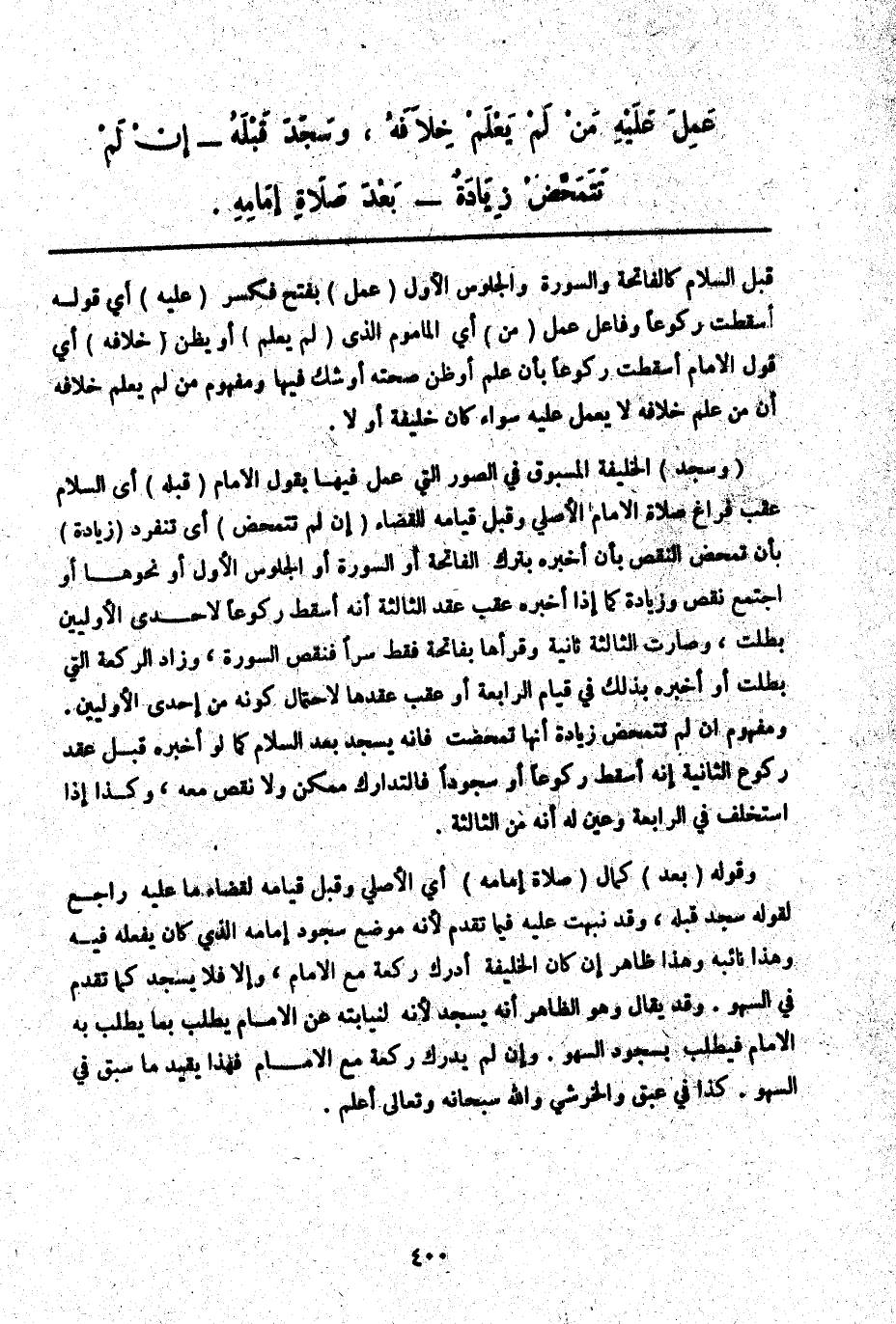 ـــــــــــــــــــــــــــــQقَبْلَ السَّلَامِ كَالْفَاتِحَةِ وَالسُّورَةِ وَالْجُلُوسِ الْأَوَّلِ (عَمِلَ) بِفَتْحٍ فَكَسْرٍ (عَلَيْهِ) أَيْ قَوْلُهُ أَسْقَطْت رُكُوعًا وَفَاعِلُ عَمِلَ (مَنْ) أَيْ الْمَأْمُومُ الَّذِي (لَمْ يَعْلَمْ) أَوْ يَظُنُّ (خِلَافَهُ) أَيْ قَوْلِ الْإِمَامِ أَسْقَطْت رُكُوعًا بِأَنْ عَلِمَ أَوْ ظَنَّ صِحَّتَهُ أَوْ شَكَّ فِيهِمَا وَمَفْهُومُ مَنْ لَمْ يَعْلَمْ خِلَافَهُ أَنَّ مَنْ عَلِمَ خِلَافَهُ لَا يَعْمَلُ عَلَيْهِ سَوَاءٌ كَانَ خَلِيفَةً أَوْ لَا.