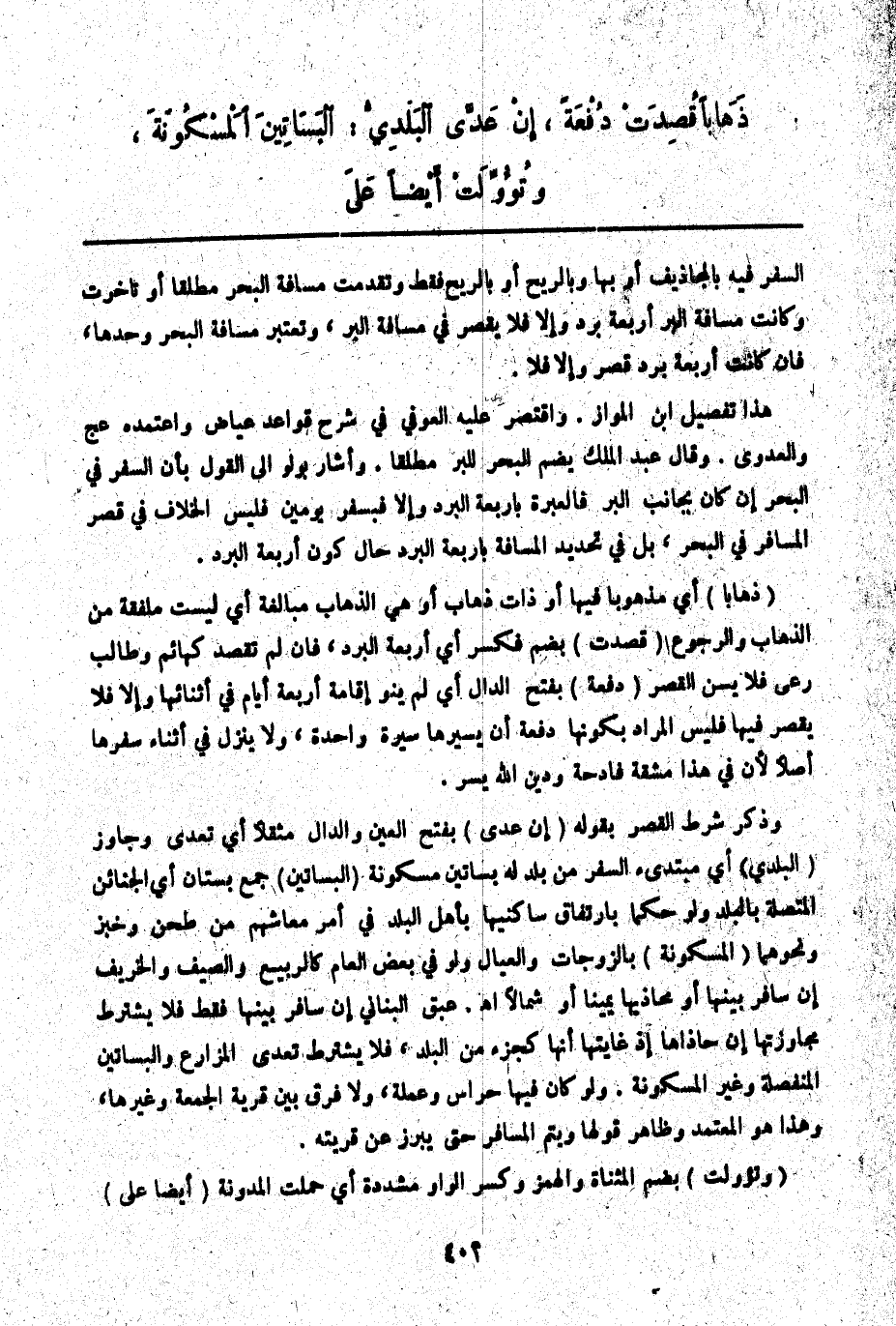 وَذَكَرَ شَرْطَ الْقَصْرِ بِقَوْلِهِ (إنْ عَدَّى) بِفَتْحِ الْعَيْنِ وَالدَّالِ مُثَقَّلًا أَيْ تَعَدَّى وَجَاوَزَ (الْبَلَدِيُّ) أَيْ مُبْتَدِئُ السَّفَرِ مِنْ بَلَدٍ لَهُ بَسَاتِينُ مَسْكُونَةٌ (الْبَسَاتِينَ) جَمْعُ بُسْتَانٍ أَيْ الْجَنَائِنُ الْمُتَّصِلَةُ بِالْبَلَدِ وَلَوْ حُكْمًا بِارْتِفَاقِ سَاكِنِيهَا بِأَهْلِ الْبَلَدِ فِي أَمْرِ مَعَاشِهِمْ مِنْ طَحْنٍ وَخَبْزٍ وَنَحْوِهِمَا (الْمَسْكُونَةَ) بِالزَّوْجَاتِ وَالْعِيَالِ وَلَوْ فِي بَعْضِ الْعَامِ كَالرَّبِيعِ وَالصَّيْفِ وَالْخَرِيفِ إنْ سَافَرَ بَيْنَهَا أَوْ مُحَاذِيهَا يَمِينًا أَوْ شِمَالًا. اهـ. عبق الْبُنَانِيُّ إنْ سَافَرَ بَيْنَهَا فَقَطْ فَلَا يُشْتَرَطُ مُجَاوَزَتُهَا إنْ حَاذَاهَا إذْ غَايَتُهَا أَنَّهَا كَجُزْءٍ مِنْ الْبَلَدِ، فَلَا يُشْتَرَطُ تَعَدِّي الْمَزَارِعِ وَالْبَسَاتِينِ الْمُنْفَصِلَةِ وَغَيْرِ الْمَسْكُونَةِ. وَلَوْ كَانَ فِيهَا حُرَّاسٌ وَعَمَلَةٌ، وَلَا فَرْقَ بَيْنَ قَرْيَةِ الْجُمُعَةِ وَغَيْرِهَا، وَهَذَا هُوَ الْمُعْتَمَدُ وَظَاهِرُ قَوْلِهَا وَيُتِمُّ الْمُسَافِرُ حَتَّى يَبْرُزَ عَنْ قَرْيَتِهِ.