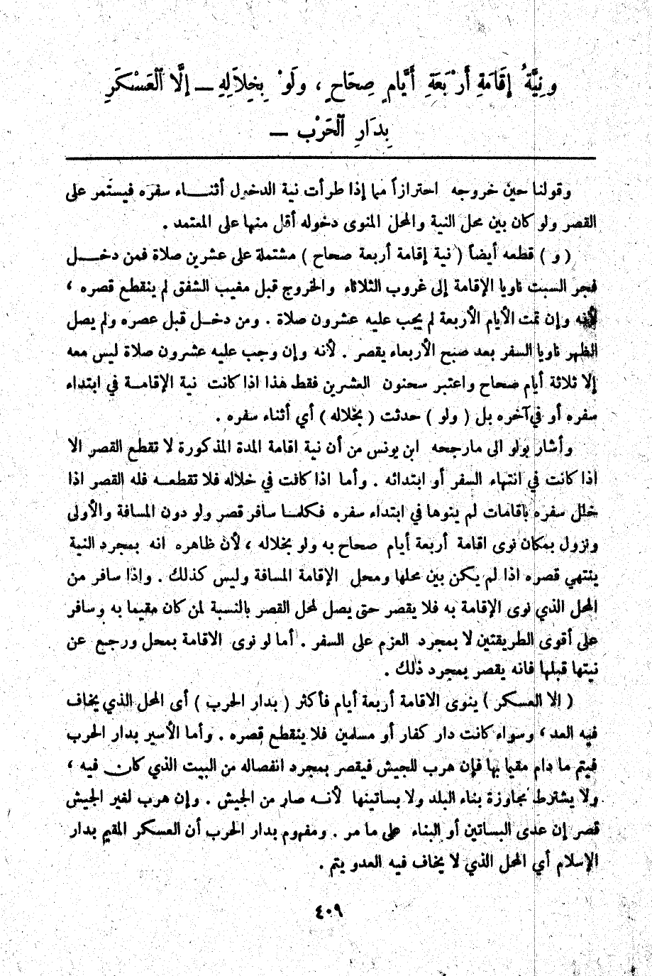 (إلَّا الْعَسْكَرَ) يَنْوِي الْإِقَامَةَ أَرْبَعَةَ أَيَّامٍ فَأَكْثَرَ (بِدَارِ الْحَرْبِ) أَيْ الْمَحَلِّ الَّذِي يُخَافُ فِيهِ الْعَدُوُّ، سَوَاءٌ كَانَتْ دَارَ كُفَّارٍ أَوْ مُسْلِمِينَ فَلَا يَنْقَطِعُ قَصْرُهُ. وَأَمَّا الْأَسِيرُ بِدَارِ الْحَرْبِ فَيُتِمُّ مَا دَامَ مُقِيمًا بِهَا فَإِنْ هَرَبَ لِلْجَيْشِ فَيَقْصُرُ بِمُجَرَّدِ انْفِصَالِهِ مِنْ الْبَيْتِ الَّذِي كَانَ فِيهِ، وَلَا يُشْتَرَطُ مُجَاوَزَةُ بِنَاءِ الْبَلَدِ وَلَا بَسَاتِينِهَا؛ لِأَنَّهُ صَارَ مِنْ الْجَيْشِ. وَإِنْ هَرَبَ لِغَيْرِ الْجَيْشِ قَصَرَ إنْ عَدَّى الْبَسَاتِينَ أَوْ الْبِنَاءَ عَلَى مَا مَرَّ. وَمَفْهُومُ بِدَارِ الْحَرْبِ أَنَّ الْعَسْكَرَ الْمُقِيمَ بِدَارِ الْإِسْلَامِ أَيْ الْمَحَلِّ الَّذِي لَا يَخَافُ فِيهِ الْعَدُوَّ يُتِمُّ.