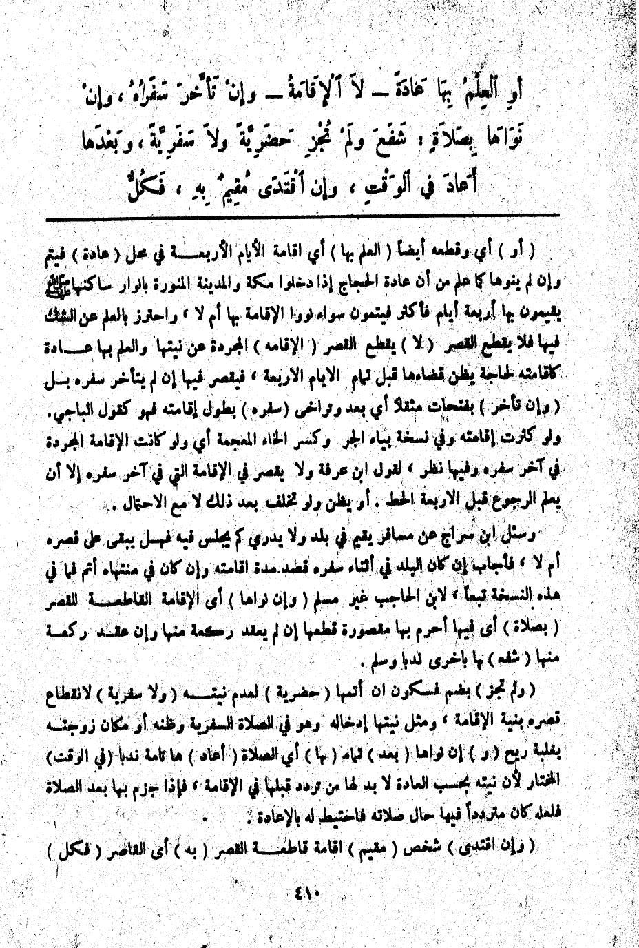 وَسُئِلَ ابْنُ سِرَاجٍ عَنْ مُسَافِرٍ يُقِيمُ فِي بَلَدٍ وَلَا يَدْرِي كَمْ يَجْلِسُ فِيهِ فَهَلْ يَبْقَى عَلَى قَصْرِهِ أَمْ لَا، فَأَجَابَ إنْ كَانَ الْبَلَدُ فِي أَثْنَاءِ سَفَرِهِ قَصَدَ مُدَّةَ إقَامَتِهِ، وَإِنْ كَانَ فِي مُنْتَهَاهُ أَتَمَّ فَمَا فِي هَذِهِ النُّسْخَةِ تَبَعًا لِابْنِ الْحَاجِبِ غَيْرُ مُسَلَّمٍ (وَإِنْ نَوَاهَا) أَيْ الْإِقَامَةَ الْقَاطِعَةَ لِلْقَصْرِ (بِصَلَاةٍ) أَيْ فِيهَا أَحْرَمَ بِهَا مَقْصُورَةً قَطَعَهَا إنْ لَمْ يَعْقِدْ رَكْعَةً مِنْهَا، وَإِنْ عَقَدَ رَكْعَةً مِنْهَا (شَفَعَ) هَا بِأُخْرَى نَدْبًا وَسَلَّمَ.