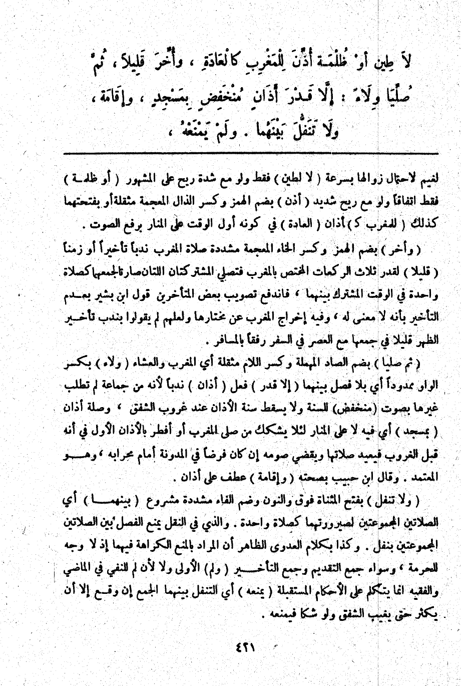 (وَأُخِّرَ) بِضَمِّ الْهَمْزِ، وَكَسْرِ الْخَاءِ الْمُعْجَمَةِ مُشَدَّدَةً صَلَاةُ الْمَغْرِبِ نَدْبًا تَأْخِيرًا أَوْ زَمَنًا (قَلِيلًا) لِقَدْرِ ثَلَاثِ الرَّكَعَاتِ الْمُخْتَصِّ بِالْمَغْرِبِ فَتُصَلَّى الْمُشْتَرَكَتَانِ اللَّتَانِ صَارَتَا لِجَمْعِهِمَا كَصَلَاةٍ وَاحِدَةٍ فِي الْوَقْتِ الْمُشْتَرَكِ بَيْنَهُمَا، فَانْدَفَعَ تَصْوِيبُ بَعْضِ الْمُتَأَخِّرِينَ قَوْلَ ابْنِ بَشِيرٍ بِعَدَمِ التَّأْخِيرِ بِأَنَّهُ لَا مَعْنَى لَهُ، وَفِيهِ إخْرَاجُ الْمَغْرِبِ عَنْ مُخْتَارِهَا وَلَعَلَّهُمْ لَمْ يَقُولُوا بِنَدْبِ تَأْخِيرِ الظُّهْرِ قَلِيلًا فِي جَمْعِهَا مَعَ الْعَصْرِ فِي السَّفَرِ رِفْقًا بِالْمُسَافِرِ.