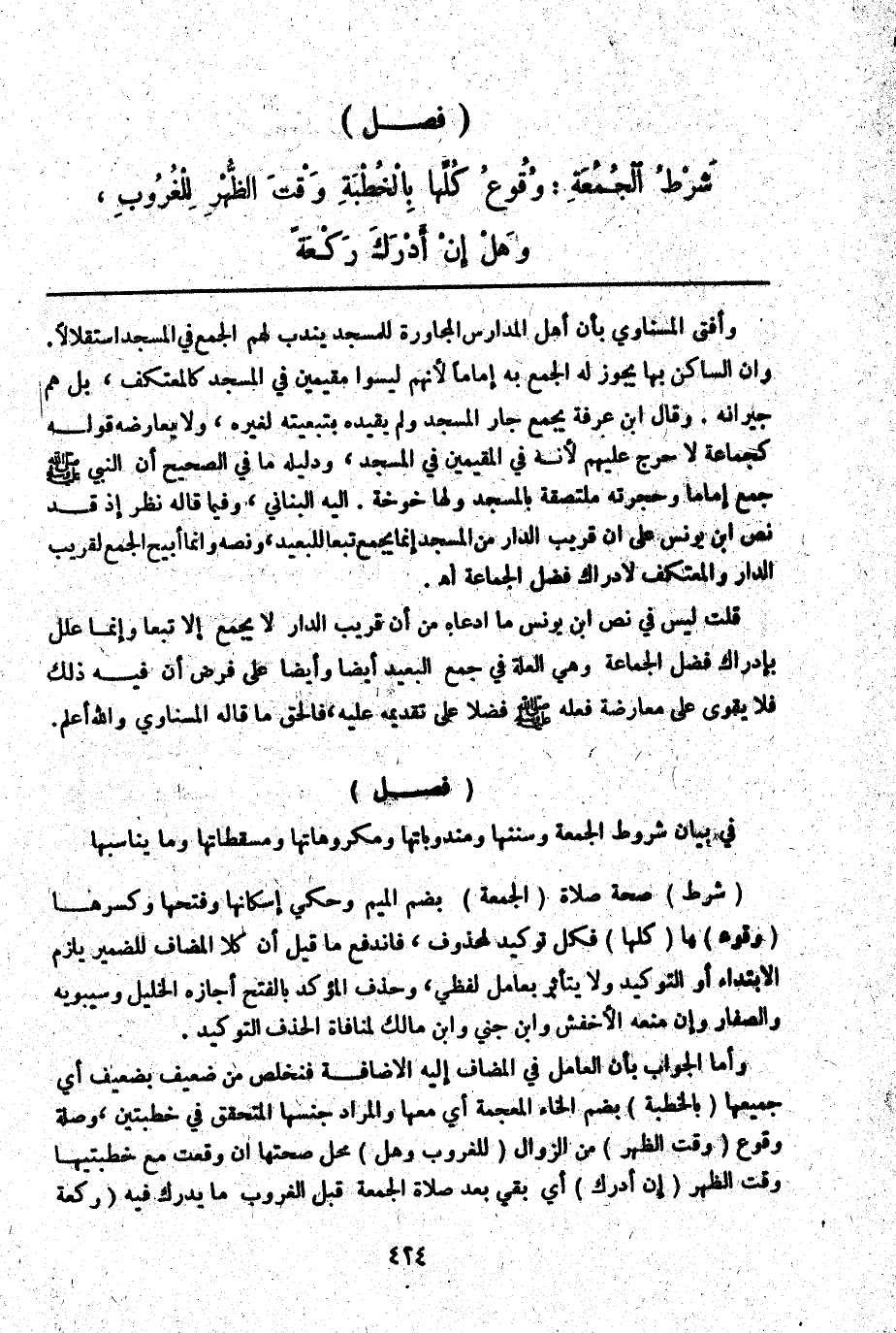 (فَصْلٌ) فِي بَيَانِ شُرُوطِ الْجُمُعَةِ وَسُنَنِهَا وَمَنْدُوبَاتِهَا وَمَكْرُوهَاتِهَا وَمُسْقِطَاتِهَا وَمَا يُنَاسِبُهَا (شَرْطُ) صِحَّةِ صَلَاةِ (الْجُمُعَةِ) بِضَمِّ الْمِيمِ وَحُكِيَ إسْكَانُهَا وَفَتْحُهَا، وَكَسْرُهَا (وُقُوعُ) هَا (كُلِّهَا) فَكُلُّ تَوْكِيدٌ لِمَحْذُوفٍ، فَانْدَفَعَ مَا قِيلَ إنَّ كُلًّا الْمُضَافَ لِلضَّمِيرِ يَلْزَمُ الِابْتِدَاءُ أَوْ التَّوْكِيدُ وَلَا يَتَأَثَّرُ بِعَامِلٍ لَفْظِيٍّ، وَحَذْفُ الْمُؤَكَّدِ بِالْفَتْحِ أَجَازَهُ الْخَلِيلُ وَسِيبَوَيْهِ وَالصَّفَّارُ، وَإِنْ مَنَعَهُ الْأَخْفَشُ وَابْنُ جِنِّيٍّ وَابْنُ مَالِكٍ لِمُنَافَاةِ الْحَذْفِ التَّوْكِيدَ.