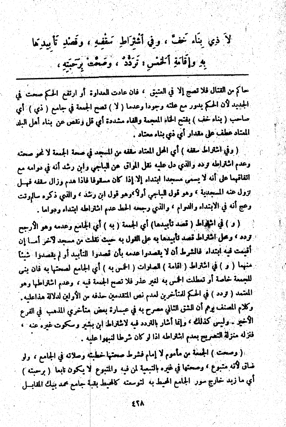 ـــــــــــــــــــــــــــــQحَاكِمٌ مِنْ الْقِتَالِ فَلَا تَصِحُّ إلَّا فِي الْعَتِيقِ، فَإِنْ عَادَتْ الْعَدَاوَةُ أَوْ ارْتَفَعَ الْحُكْمُ صَحَّتْ فِي الْجَدِيدِ؛ لِأَنَّ الْحُكْمَ يَدُورُ مَعَ عِلَّتِهِ وُجُودًا وَعَدَمًا (لَا) تَصِحُّ الْجُمُعَةُ فِي جَامِعٍ (ذِي) أَيْ صَاحِبِ (بِنَاءٍ خَفَّ) بِفَتْحِ الْخَاءِ الْمُعْجَمَةِ وَالْفَاءِ مُشَدَّدَةً أَيْ قَلَّ وَنَقَصَ عَنْ بِنَاءِ أَهْلِ الْبَلَدِ الْمُعْتَادِ عَطْفٌ عَلَى مِقْدَارِ أَيْ ذِي بِنَاءٍ مُعْتَادٍ.