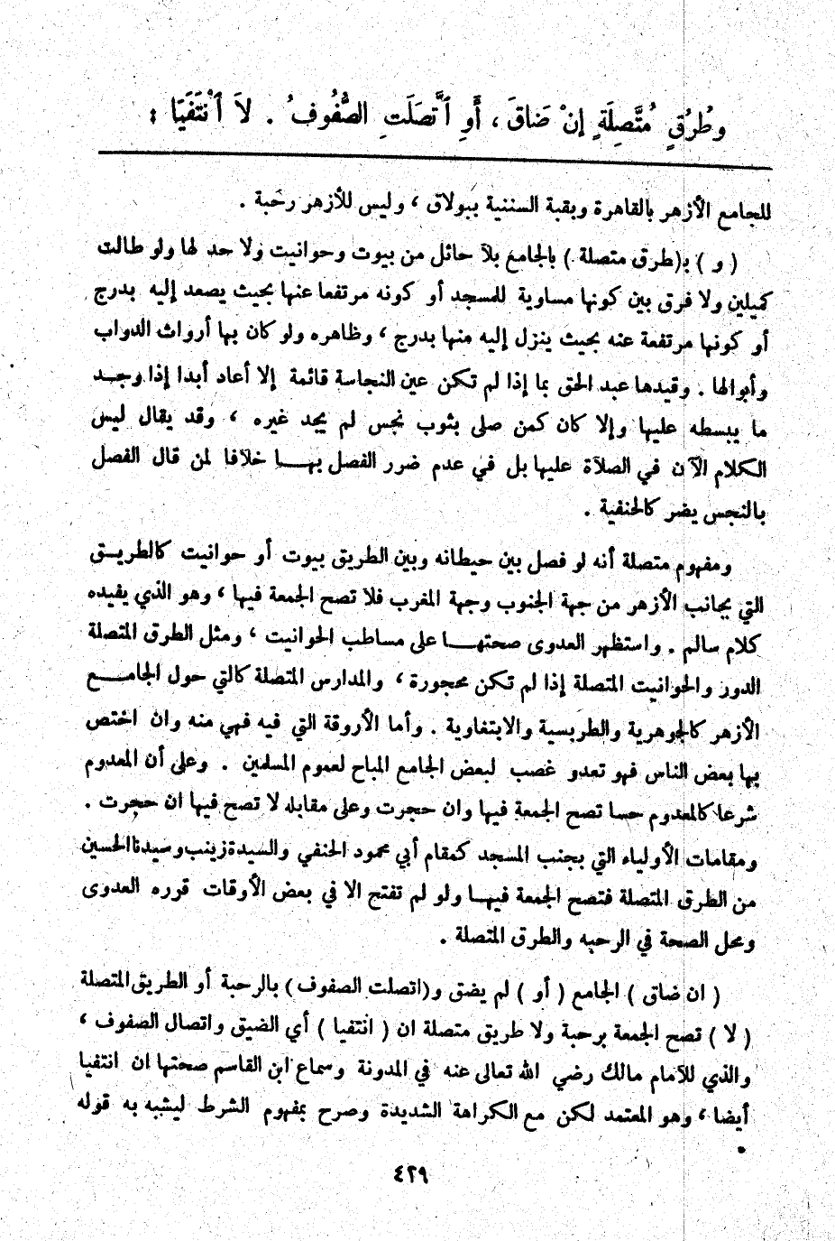 وَمَفْهُومُ مُتَّصِلَةٍ أَنَّهُ لَوْ فَصَلَ بَيْنَ حِيطَانِهِ وَبَيْنَ الطَّرِيقِ بُيُوتٌ أَوْ حَوَانِيتُ كَالطَّرِيقِ الَّتِي بِجَانِبِ الْأَزْهَرِ مِنْ جِهَةِ الْجَنُوبِ وَجِهَةِ الْمَغْرِبِ فَلَا تَصِحُّ الْجُمُعَةُ فِيهَا، وَهُوَ الَّذِي يُفِيدُهُ كَلَامُ سَالِمٍ. وَاسْتَظْهَرَ الْعَدَوِيُّ صِحَّتَهَا عَلَى مَسَاطِبِ الْحَوَانِيتِ، وَمِثْلُ الطُّرُقِ الْمُتَّصِلَةِ الدُّورُ وَالْحَوَانِيتُ الْمُتَّصِلَةُ إذَا لَمْ تَكُنْ مَحْجُورَةً، وَالْمَدَارِسُ الْمُتَّصِلَةُ كَاَلَّتِي حَوْلَ الْجَامِعِ الْأَزْهَرِ كَالْجَوْهَرِيَّةِ وَالطَّرْبَسِيَّةِ والابتغاوية. وَأَمَّا الْأَرْوِقَةُ الَّتِي فِيهِ فَهِيَ مِنْهُ وَإِنْ اخْتَصَّ بِهَا بَعْضُ النَّاسِ فَهُوَ تَعَدٍّ وَغَصْبٌ لِبَعْضِ الْجَامِعِ الْمُبَاحِ لِعُمُومِ الْمُسْلِمِينَ. وَعَلَى أَنَّ الْمَعْدُومَ شَرْعًا كَالْمَعْدُومِ حِسًّا تَصِحُّ الْجُمُعَةُ فِيهَا، وَإِنْ حُجِرَتْ، وَعَلَى مُقَابِلِهِ لَا تَصِحُّ فِيهَا إنْ حُجِرَتْ. وَمَقَامَاتُ الْأَوْلِيَاءِ الَّتِي بِجَنْبِ الْمَسْجِدِ كَمَقَامِ أَبِي مَحْمُودٍ الْحَنَفِيِّ وَالسَّيِّدَةِ زَيْنَبَ وَسَيِّدِنَا الْحُسَيْنِ مِنْ الطُّرُقِ الْمُتَّصِلَةِ فَتَصِحُّ الْجُمُعَةُ فِيهَا وَلَوْ لَمْ تُفْتَحْ إلَّا فِي بَعْضِ الْأَوْقَاتِ قَرَّرَهُ الْعَدَوِيُّ وَمَحَلُّ الصِّحَّةِ فِي الرَّحْبَةِ وَالطُّرُقِ الْمُتَّصِلَةِ.