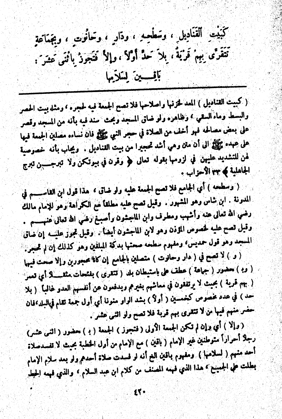 كَبَيْتِ الْقَنَادِيلِ، وَسَطْحِهِ، وَدَارٍ، وَحَانُوتٍ، وَبِجَمَاعَةٍ تَتَقَرَّى بِهِمْ قَرْيَةٌ، بِلَا حَدٍّ أَوَّلًا، وَإِلَّا فَتَجُوزُ بِاثْنَيْ عَشَرَ: بَاقِينَ لِسَلَامِهَا