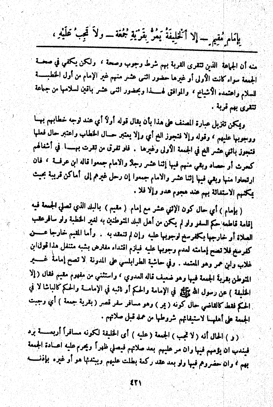 بِإِمَامٍ مُقِيمٍ إلَّا الْخَلِيفَةُ يَمُرُّ بِقَرْيَةِ جُمُعَةٍ وَلَا تَجِبُ عَلَيْهِ،