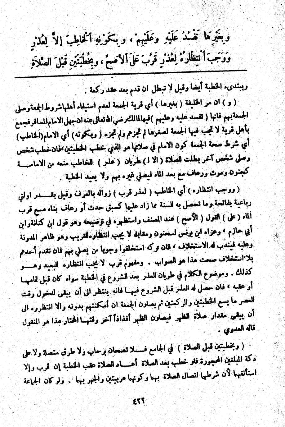 ـــــــــــــــــــــــــــــQوَيَبْتَدِئُ الْخُطْبَةَ أَيْضًا، وَقِيلَ لَا تَبْطُلُ إنْ قَدِمَ بَعْدَ عَقْدِ رَكْعَةٍ. (وَ) إنْ مَرَّ الْخَلِيفَةُ (بِغَيْرِهَا) أَيْ قَرْيَةِ الْجُمُعَةِ لِعَدَمِ اسْتِيفَاءِ أَهْلِهَا شُرُوطَ الْجُمُعَةِ وَصَلَّى الْجُمُعَةَ بِهِمْ فَإِنَّهَا (تَفْسُدُ عَلَيْهِ وَعَلَيْهِمْ) فِيهَا لِمَالِكٍ - رَضِيَ اللَّهُ تَعَالَى عَنْهُ - إنْ جَهِلَ الْإِمَامُ الْمُسَافِرُ فَجَمَعَ بِأَهْلِ قَرْيَةٍ لَا تَجِبُ فِيهَا الْجُمُعَةُ لِصِغَرِهَا لَمْ تُجْزِهِمْ وَلَمْ تُجْزِهِ.