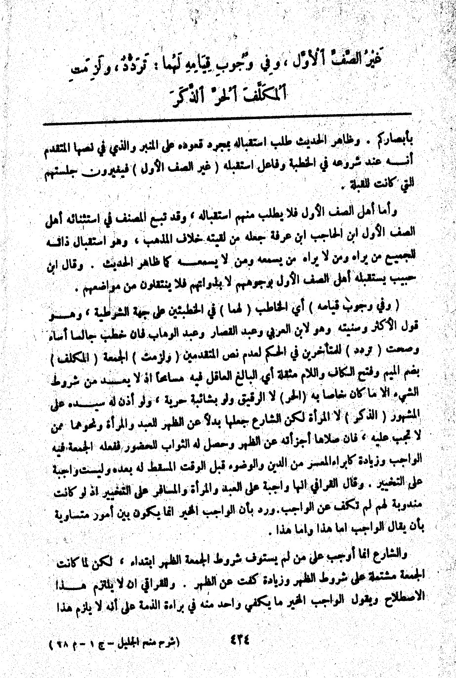 ـــــــــــــــــــــــــــــQبِأَبْصَارِكُمْ» . وَظَاهِرُ الْحَدِيثِ طَلَبُ اسْتِقْبَالِهِ بِمُجَرَّدِ قُعُودِهِ عَلَى الْمِنْبَرِ وَاَلَّذِي فِي نَصِّهَا الْمُتَقَدِّمِ أَنَّهُ عِنْدَ شُرُوعِهِ فِي الْخُطْبَةِ وَفَاعِلُ اسْتَقْبَلَهُ (غَيْرُ الصَّفِّ الْأَوَّلِ) فَيُغَيِّرُونَ جِلْسَتَهُمْ الَّتِي كَانَتْ لِلْقِبْلَةِ.