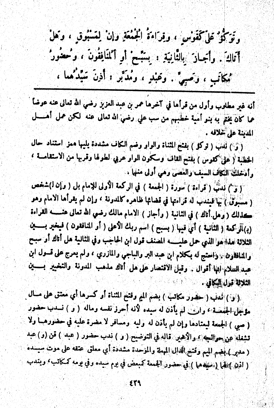 (وَ) نُدِبَ (حُضُورُ مُكَاتَبٍ) بِضَمِّ الْمِيمِ وَفَتْحِ الْمُثَنَّاةِ أَوْ كَسْرِهَا أَيْ مُعْتَقٌ عَلَى مَالٍ مُؤَجَّلٍ الْجُمُعَةَ، وَإِنْ لَمْ يَأْذَنْ لَهُ سَيِّدُهُ؛ لِأَنَّهُ أَحْرَزَ نَفْسَهُ وَمَالَهُ (وَ) نُدِبَ حُضُورُ (صَبِيٍّ) الْجُمُعَةَ لِيَعْتَادَهَا، وَإِنْ لَمْ يَأْذَنْ لَهُ وَلِيُّهُ وَمُسَافِرٌ لَا مَضَرَّةَ عَلَيْهِ فِي حُضُورِهَا وَلَا تَشْغَلُهُ عَنْ حَوَائِجِهِ، وَالْأَخِيرُ قَالَهُ فِي التَّوْضِيحِ (وَ) نُدِبَ حُضُورُ (عَبْدٍ) قِنٍّ (وَ) عَبْدٍ (مُدَبَّرٍ) بِضَمِّ الْمِيمِ وَفَتْحِ الدَّالِ الْمُهْمَلَةِ وَالْمُوَحَّدَةِ مُشَدَّدَةً أَيْ مُعَلَّقٌ عِتْقُهُ عَلَى مَوْتِ سَيِّدِهِ (أَذِنَ) لَهُمَا (سَيِّدُهُمَا) فِي حُضُورِ الْجُمُعَةِ كَمُبَعَّضٍ فِي يَوْمِ سَيِّدِهِ وَفِي يَوْمِهِ كَمُكَاتَبٍ، وَيُنْدَبُ