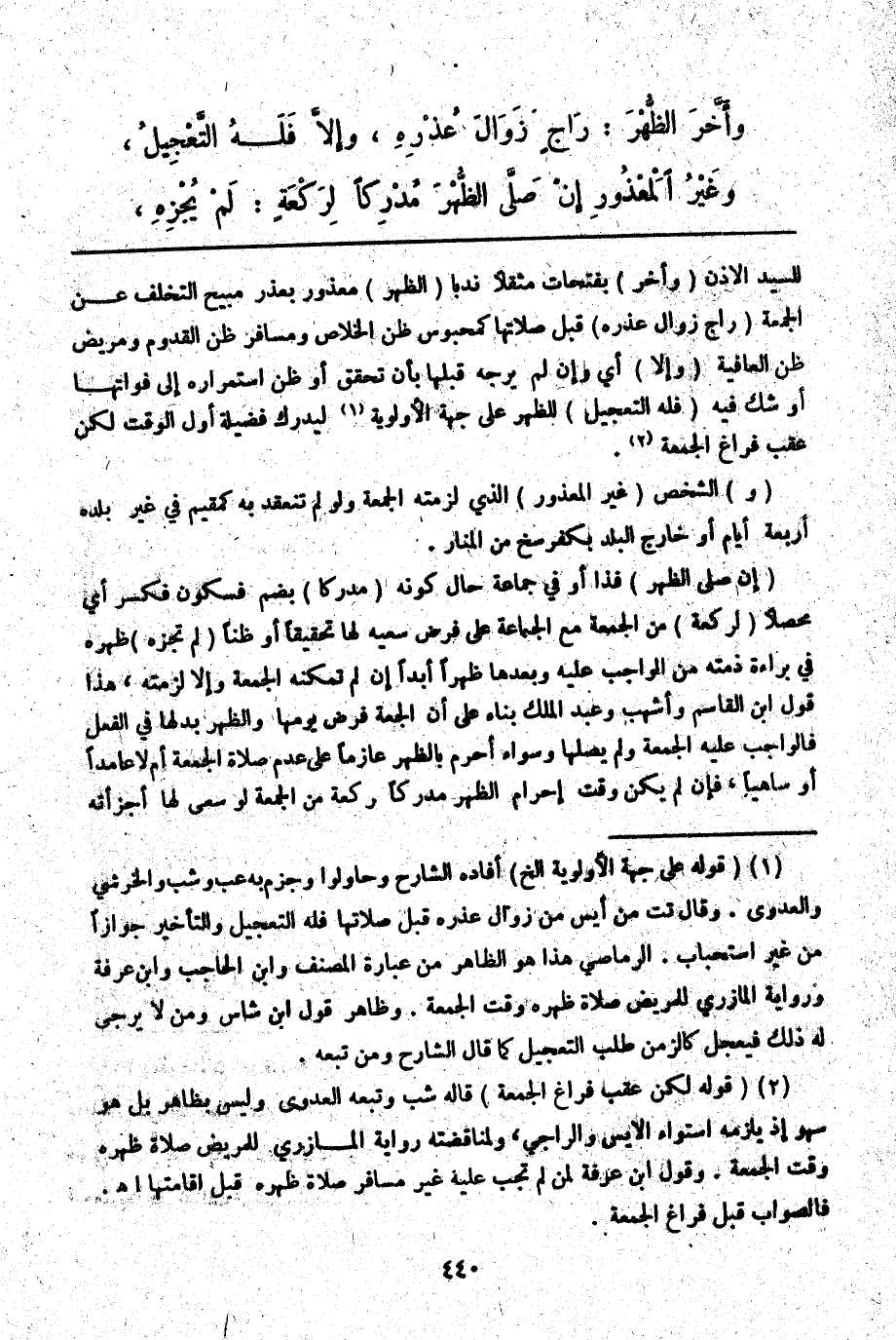 (وَ) الشَّخْصُ (غَيْرُ الْمَعْذُورِ) الَّذِي لَزِمَتْهُ الْجُمُعَةُ وَلَوْ لَمْ تَنْعَقِدْ بِهِ كَمُقِيمٍ فِي غَيْرِ بَلَدِهِ أَرْبَعَةَ أَيَّامٍ أَوْ خَارِجَ الْبَلَدِ بِكَفَرْسَخٍ مِنْ النَّارِ. (إنْ صَلَّى الظُّهْرَ) فَذًّا أَوْ فِي جَمَاعَةٍ حَالَ كَوْنِهِ (مُدْرِكًا) بِضَمٍّ فَسُكُونٍ فَكَسْرٍ أَيْ مُحَصِّلًا (لِرَكْعَةٍ) مِنْ الْجُمُعَةِ مَعَ الْجَمَاعَةِ عَلَى فَرْضِ سَعْيِهِ لَهَا تَحْقِيقًا أَوْ ظَنًّا (لَمْ تُجْزِهِ) ظُهْرُهُ فِي بَرَاءَةِ ذِمَّتِهِ مِنْ الْوَاجِبِ عَلَيْهِ وَبَعْدَهَا ظُهْرًا أَبَدًا إنْ لَمْ تُمْكِنْهُ الْجُمُعَةُ، وَإِلَّا لَزِمَتْهُ، هَذَا قَوْلُ ابْنِ الْقَاسِمِ وَأَشْهَبَ وَعَبْدِ الْمَلِكِ بِنَاءً عَلَى أَنَّ الْجُمُعَةَ فَرْضُ يَوْمِهَا وَالظُّهْرَ بَدَلُهَا فِي الْفِعْلِ فَالْوَاجِبُ عَلَيْهِ الْجُمُعَةُ وَلَمْ يُصَلِّهَا وَسَوَاءٌ أَحْرَمَ بِالظُّهْرِ عَازِمًا عَلَى عَدَمِ صَلَاةِ الْجُمُعَةِ أَمْ لَا عَامِدًا أَوْ سَاهِيًا، فَإِنْ لَمْ يَكُنْ وَقْتَ إحْرَامِ الظُّهْرِ مُدْرِكًا رَكْعَةً مِنْ الْجُمُعَةِ لَوْ سَعَى لَهَا أَجْزَأَتْهُ