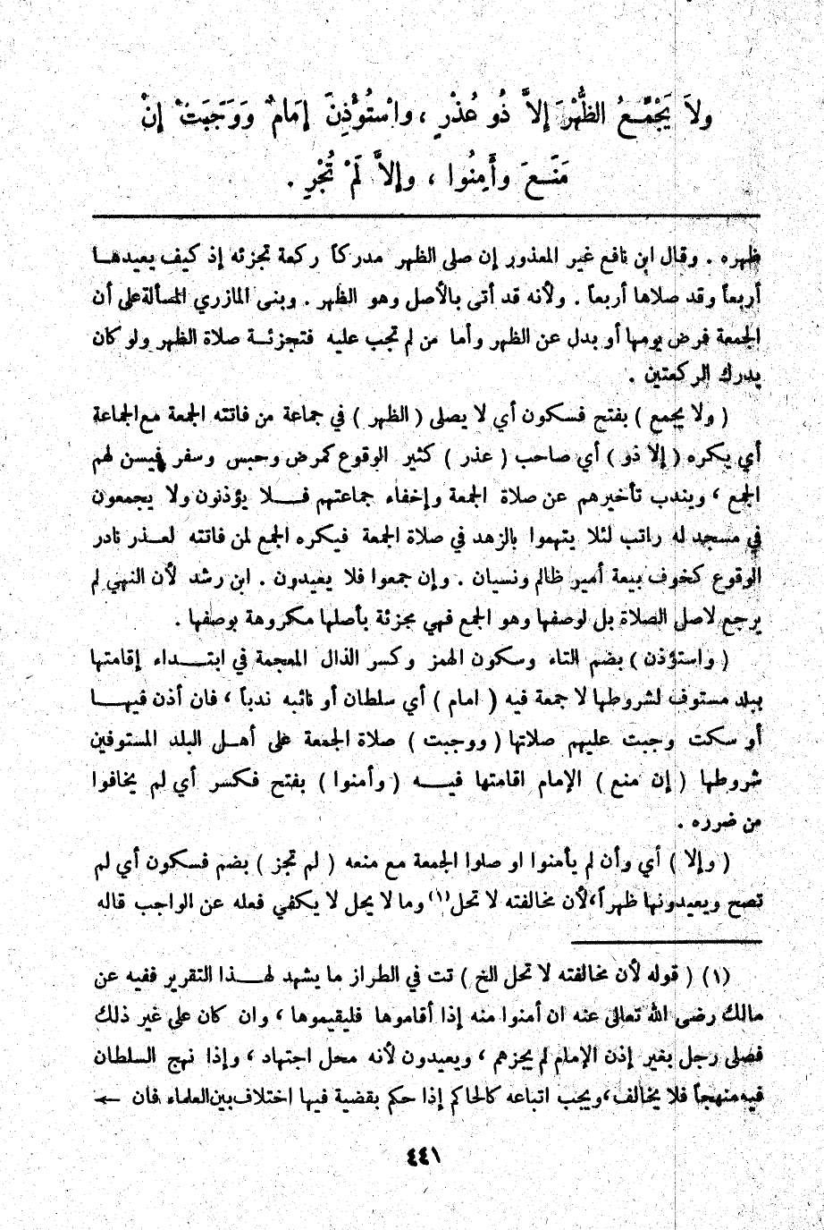 (وَلَا يَجْمَعُ) بِفَتْحٍ فَسُكُونٍ أَيْ لَا يُصَلِّي (الظُّهْرَ) فِي جَمَاعَةٍ مَنْ فَاتَتْهُ الْجُمُعَةُ مَعَ الْجَمَاعَةِ أَيْ يُكْرَهُ (إلَّا ذُو) أَيْ صَاحِبُ (عُذْرٍ) كَثِيرِ الْوُقُوعِ كَمَرَضٍ وَحَبْسٍ وَسَفَرٍ فَيُسَنُّ لَهُمْ الْجَمْعُ، وَيُنْدَبُ تَأْخِيرُهُمْ عَنْ صَلَاةِ الْجُمُعَةِ، وَإِخْفَاءُ جَمَاعَتِهِمْ فَلَا يُؤَذِّنُونَ وَلَا يَجْمَعُونَ فِي مَسْجِدٍ لَهُ رَاتِبٌ لِئَلَّا يُتَّهَمُوا بِالزُّهْدِ فِي صَلَاةِ الْجُمُعَةِ فَيُكْرَهُ الْجَمْعُ لِمَنْ فَاتَتْهُ لِعُذْرٍ نَادِرِ الْوُقُوعِ كَخَوْفِ بَيْعَةِ أَمِيرٍ ظَالِمٍ وَنِسْيَانٍ. وَإِنْ جَمَعُوا فَلَا يُعِيدُونَ. ابْنُ رُشْدٍ لِأَنَّ النَّهْيَ لَمْ يَرْجِعْ لِأَصْلِ الصَّلَاةِ بَلْ لِوَصْفِهَا، وَهُوَ الْجَمْعُ فَهِيَ مُجْزِئَةٌ بِأَصْلِهَا مَكْرُوهَةٌ بِوَصْفِهَا.