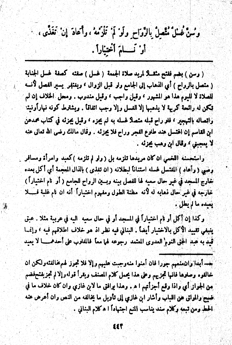ـــــــــــــــــــــــــــــQوَسُنَّ) بِضَمٍّ فَفَتْحٍ مُثَقَّلًا لِمُرِيدِ صَلَاةِ الْجُمُعَةِ (غُسْلٌ) صِفَتُهُ كَصِفَةِ غُسْلِ الْجَنَابَةِ (مُتَّصِلٌ بِالرَّوَاحِ) أَيْ الذَّهَابِ إلَى الْجَامِعِ وَلَوْ قَبْلَ الزَّوَالِ، وَيُغْتَفَرُ يَسِيرُ الْفَصْلِ؛ لِأَنَّهُ لِلصَّلَاةِ لَا لِلْيَوْمِ هَذَا هُوَ الْمَشْهُورُ، وَقِيلَ وَاجِبٌ، وَقِيلَ مَنْدُوبٌ. وَمَحَلُّ الْخِلَافِ إنْ لَمْ تَكُنْ لَهُ رَائِحَةٌ كَرِيهَةٌ لَا يُذْهِبُهَا إلَّا الْغُسْلُ، وَإِلَّا وَجَبَ اتِّفَاقًا. وَيُشْتَرَطُ كَوْنُهُ نَهَارًا وَنِيَّتُهُ وَاتِّصَالُهُ بِالتَّهْجِيرِ، فَلَوْ رَاحَ قَبْلَهُ مُتَّصِلًا غُسْلُهُ بِهِ لَمْ يُجْزِهِ، وَقِيلَ يُجْزِئُهُ فِي كِتَابِ مُحَمَّدٍ عَنْ ابْنِ الْقَاسِمِ إنْ اغْتَسَلَ عِنْدَ طُلُوعِ الْفَجْرِ وَرَاحَ فَلَا يُجْزِئُهُ. وَقَالَ مَالِكٌ - رَضِيَ اللَّهُ تَعَالَى عَنْهُ - لَا يُعْجِبُنِي، وَقَالَ ابْنُ وَهْبٍ يُجْزِئُهُ.