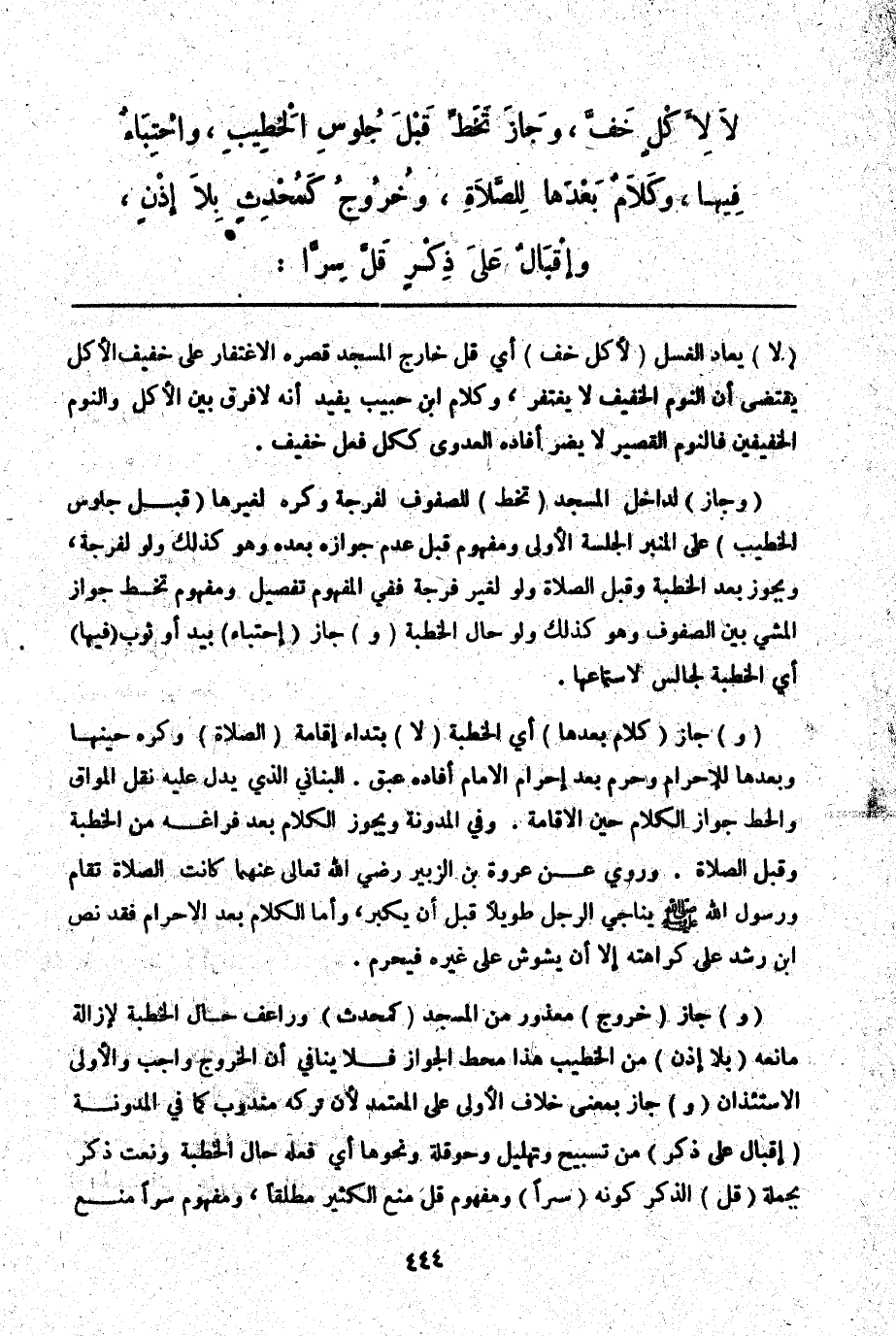 (وَجَازَ) لِدَاخِلِ الْمَسْجِدِ (تَخَطٍّ) لِلصُّفُوفِ لِفُرْجَةٍ وَكُرِهَ لِغَيْرِهَا (قَبْلَ جُلُوسِ الْخَطِيبِ) عَلَى الْمِنْبَرِ الْجِلْسَةَ الْأُولَى وَمَفْهُومُ قَبْلَ عَدَمُ جَوَازِهِ بَعْدَهُ، وَهُوَ كَذَلِكَ وَلَوْ لِفُرْجَةٍ، وَيَجُوزُ بَعْدَ الْخُطْبَةِ، وَقَبْلَ الصَّلَاةِ وَلَوْ لِغَيْرِ فُرْجَةٍ فَفِي الْمَفْهُومِ تَفْصِيلٌ وَمَفْهُومُ تَخَطٍّ جَوَازُ الْمَشْيِ بَيْنَ الصُّفُوفِ، وَهُوَ كَذَلِكَ وَلَوْ حَالَ الْخُطْبَةِ (وَ) جَازَ (احْتِبَاءٌ) بِيَدٍ أَوْ ثَوْبٍ (فِيهَا) أَيْ الْخُطْبَةِ لِجَالِسٍ لِاسْتِمَاعِهَا.