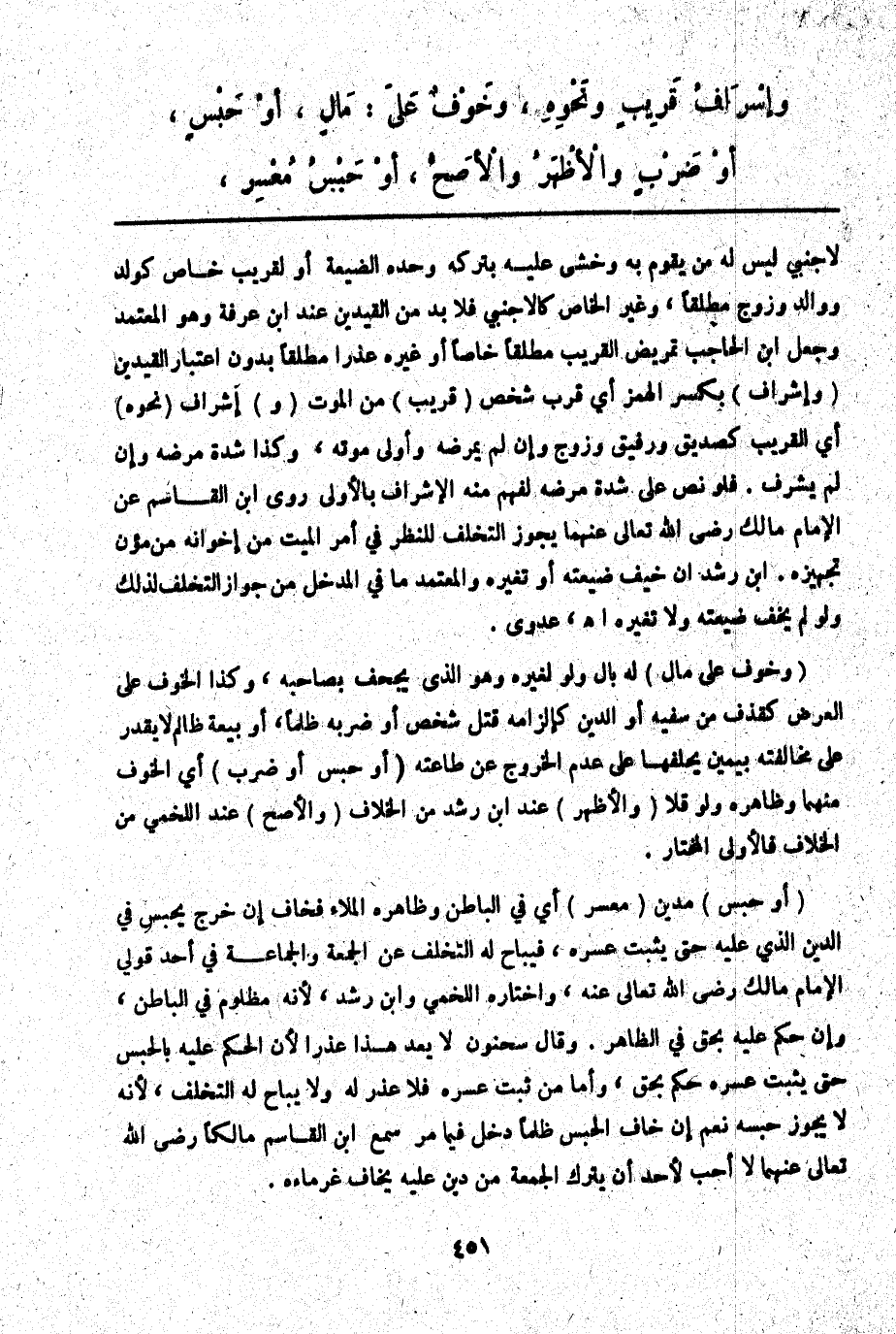 (وَخَوْفٌ عَلَى مَالٍ) لَهُ بَالٌ وَلَوْ لِغَيْرِهِ، وَهُوَ الَّذِي يُجْحِفُ بِصَاحِبِهِ، وَكَذَا الْخَوْفُ عَلَى الْعِرْضِ كَقَذْفٍ مِنْ سَفِيهٍ أَوْ الدِّينِ كَإِلْزَامِهِ قَتْلَ شَخْصٍ أَوْ ضَرْبِهِ ظُلْمًا، أَوْ بَيْعَةَ ظَالِمٍ لَا يَقْدِرُ عَلَى مُخَالَفَتِهِ بِيَمِينٍ يَحْلِفُهَا عَلَى عَدَمِ الْخُرُوجِ عَنْ طَاعَتِهِ (أَوْ حَبْسٌ أَوْ ضَرْبٌ) أَيْ الْخَوْفُ مِنْهُمَا وَظَاهِرُهُ وَلَوْ قَلَّا (وَالْأَظْهَرُ) عِنْدَ ابْنِ رُشْدٍ مِنْ الْخِلَافِ (وَالْأَصَحُّ) عِنْدَ اللَّخْمِيِّ مِنْ الْخِلَافِ فَالْأَوْلَى الْمُخْتَارُ.