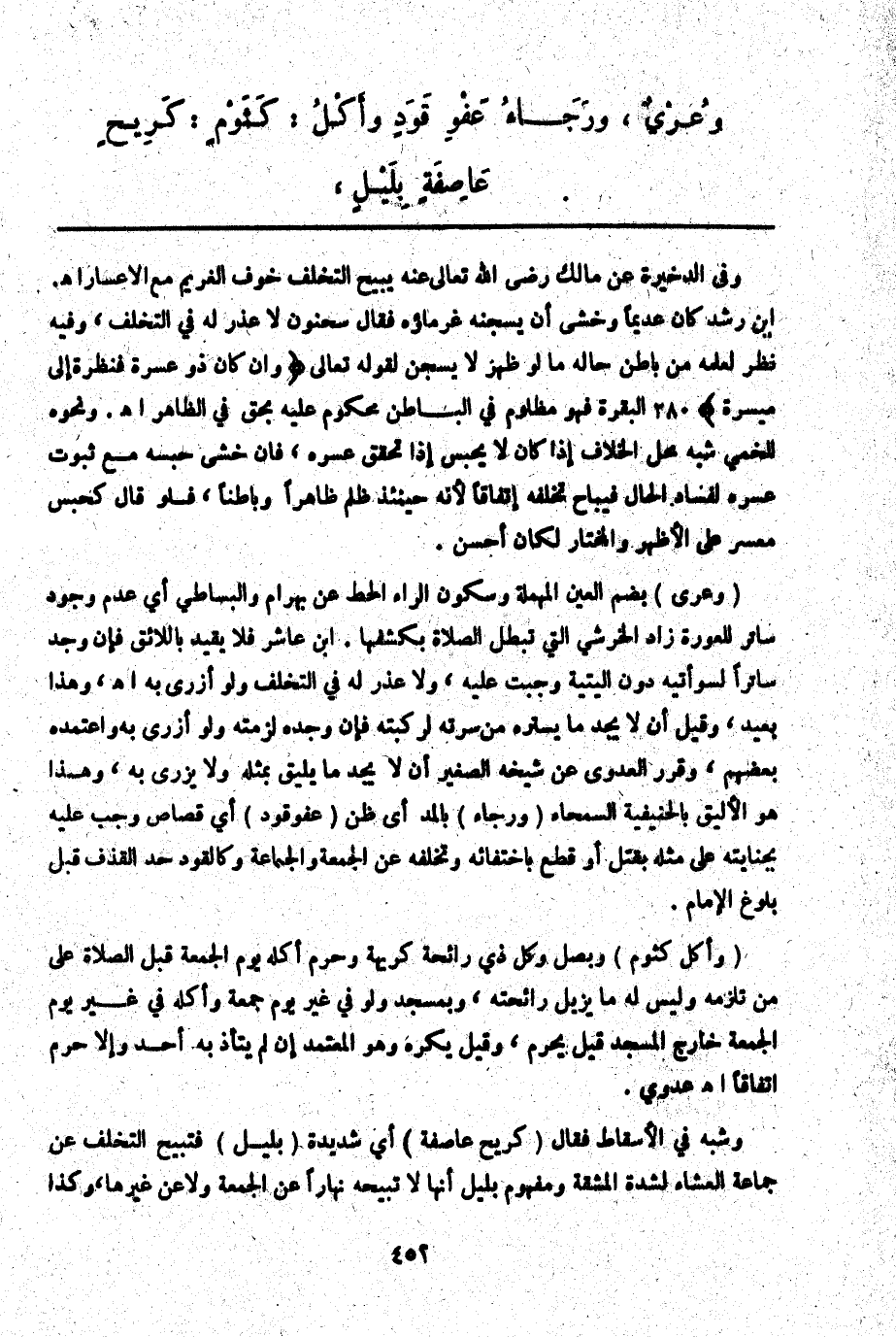 وَشَبَّهَ فِي الْإِسْقَاطِ فَقَالَ (كَرِيحٍ عَاصِفَةٍ) أَيْ شَدِيدَةٍ (بِلَيْلٍ) فَتُبِيحُ التَّخَلُّفَ عَنْ جَمَاعَةِ الْعِشَاءِ لِشِدَّةِ الْمَشَقَّةِ وَمَفْهُومُ بِلَيْلٍ أَنَّهَا لَا تُبِيحُهُ نَهَارًا عَنْ الْجُمُعَةِ وَلَا عَنْ غَيْرِهَا، وَكَذَا
