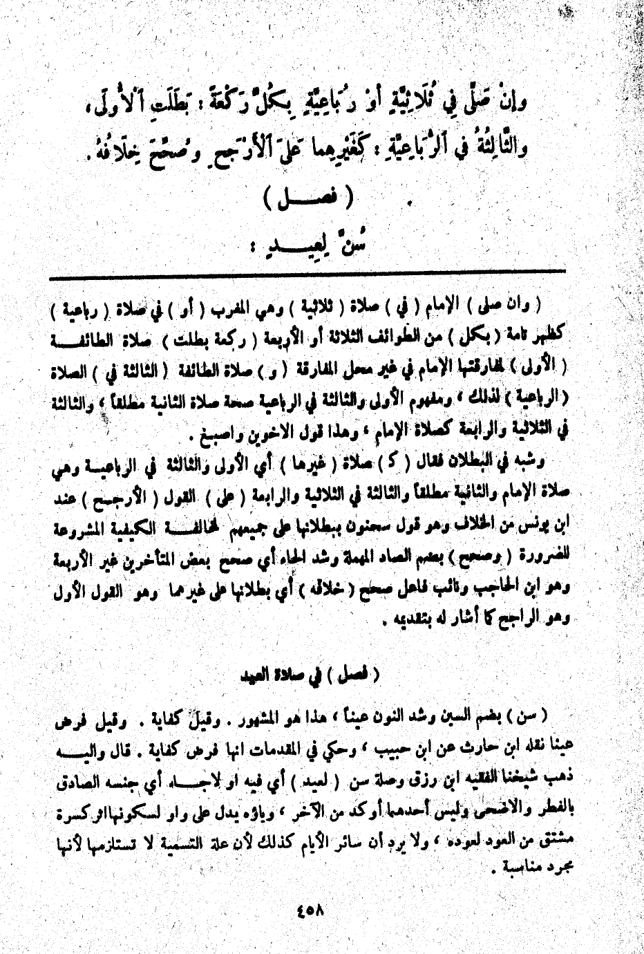 (فَصْلٌ) فِي صَلَاةِ الْعِيدِ (سُنَّ) بِضَمِّ السِّينِ وَشَدِّ النُّونِ عَيْنًا، هَذَا هُوَ الْمَشْهُورِ. وَقِيلَ كِفَايَةٌ. وَقِيلَ فَرْضُ عَيْنٍ نَقَلَهُ ابْنُ حَارِثٍ عَنْ ابْنِ حَبِيبٍ، وَحَكَى فِي الْمُقَدِّمَاتِ أَنَّهَا فَرْضُ كِفَايَةٍ. قَالَ، وَإِلَيْهِ ذَهَبَ شَيْخُنَا الْفَقِيهُ ابْنُ رِزْقٍ وَصِلَةُ سُنَّ (لِعِيدٍ) أَيْ فِيهِ أَوْ لِأَجَلِهِ أَيْ جِنْسِهِ الصَّادِقِ بِالْفِطْرِ وَالْأَضْحَى وَلَيْسَ أَحَدُهُمَا أَوْكَدَ مِنْ الْآخَرِ، وَيَاؤُهُ يَدُلُّ عَلَى وَاوٍ لِسُكُونِهَا إثْرَ كَسْرَةٍ مُشْتَقٌّ مِنْ الْعَوْدِ لِعَوْدِهِ، وَلَا يُرَادُ أَنَّ سَائِرَ الْأَيَّامِ كَذَلِكَ؛ لِأَنَّ عِلَّةَ التَّسْمِيَةِ لَا تَسْتَلْزِمُهَا؛ لِأَنَّهَا مُجَرَّدُ مُنَاسَبَةٍ.
