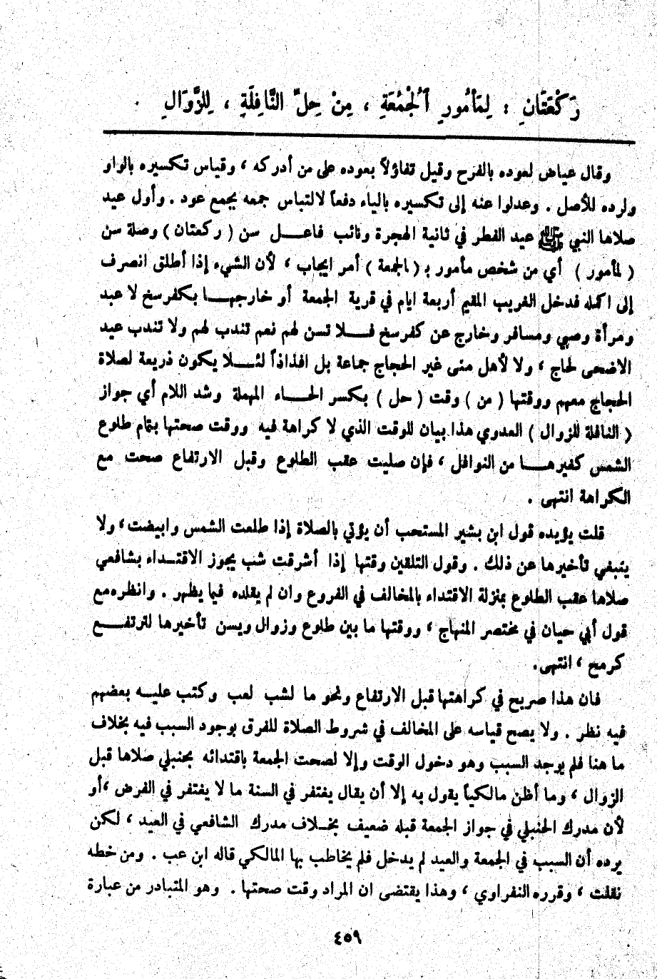ـــــــــــــــــــــــــــــQوَقَالَ عِيَاضٌ لِعَوْدِهِ بِالْفَرَحِ، وَقِيلَ تَفَاؤُلًا بِعَوْدِهِ عَلَى مَنْ أَدْرَكَهُ، وَقِيَاسُ تَكْسِيرِهِ بِالْوَاوِ وَلِرَدِّهِ لِلْأَصْلِ. وَعَدَلُوا عَنْهُ إلَى تَكْسِيرِهِ بِالْيَاءِ دَفْعًا لِالْتِبَاسِ جَمْعِهِ بِجَمْعِ عَوْدٍ. وَأَوَّلُ عِيدٍ صَلَّاهَا النَّبِيُّ - صَلَّى اللَّهُ عَلَيْهِ وَسَلَّمَ - عِيدُ الْفِطْرِ فِي ثَانِيَةِ الْهِجْرَةِ وَنَائِبُ فَاعِلِ سُنَّ (رَكْعَتَانِ) وَصِلَةُ سُنَّ (لِمَأْمُورٍ) أَيْ مِنْ شَخْصٍ مَأْمُورٍ بِ (الْجُمُعَةِ) أَمْرَ إيجَابٍ؛ لِأَنَّ الشَّيْءَ إذَا أُطْلِقَ انْصَرَفَ إلَى أَكْمَلِهِ فَدَخَلَ الْغَرِيبُ الْمُقِيمُ أَرْبَعَةَ أَيَّامٍ فِي قَرْيَةِ الْجُمُعَةِ أَوْ خَارِجَهَا بِكَفَرْسَخٍ لَا عَبْدٌ وَامْرَأَةٌ وَصَبِيٌّ وَمُسَافِرٌ وَخَارِجٌ عَنْ كَفَرْسَخٍ فَلَا تُسَنُّ لَهُمْ نَعَمْ تُنْدَبُ لَهُمْ وَلَا يُنْدَبُ عِيدُ الْأَضْحَى لِحَاجٍّ، وَلَا لِأَهْلِ مِنًى غَيْرِ الْحُجَّاجِ جَمَاعَةً بَلْ أَفْذَاذًا لِئَلَّا يَكُونَ ذَرِيعَةً لِصَلَاةِ الْحُجَّاجِ مَعَهُمْ وَوَقْتُهَا (مِنْ) ، وَقْتِ (حِلِّ) بِكَسْرِ الْحَاءِ الْمُهْمَلَةِ وَشَدِّ اللَّامِ أَيْ جَوَازِ (النَّافِلَةِ لِلزَّوَالِ) الْعَدَوِيِّ هَذَا بَيَانٌ لِلْوَقْتِ الَّذِي لَا كَرَاهَةَ فِيهِ، وَوَقْتُ صِحَّتِهَا بِتَمَامِ طُلُوعِ الشَّمْسِ كَغَيْرِهَا مِنْ النَّوَافِلِ، فَإِنْ صُلِّيَتْ عَقِبَ الطُّلُوعِ، وَقَبْلَ الِارْتِفَاعِ صَحَّتْ مَعَ الْكَرَاهَةِ انْتَهَى. قُلْت يُؤَيِّدُهُ قَوْلُ ابْنِ بَشِيرٍ الْمُسْتَحَبُّ أَنْ يُؤْتِيَ بِالصَّلَاةِ إذَا طَلَعَتْ الشَّمْسُ وَلِمُطَالَبَتِهِ، وَلَا يَنْبَغِي تَأْخِيرُهَا عَنْ ذَلِكَ. وَقَوْلُ التَّلْقِينِ وَقْتُهَا إذَا أَشْرَقَتْ شَبَّ يَجُوزُ الِاقْتِدَاءُ بِشَافِعِيٍّ صَلَّاهَا عَقِبَ الطُّلُوعِ بِمَنْزِلَةِ الِاقْتِدَاءِ بِالْمُخَالِفِ فِي الْفُرُوعِ، وَإِنْ لَمْ يُقَلِّدْهُ فِيمَا يَظْهَرُ. وَانْظُرْهُ مَعَ قَوْلِ أَبِي حَيَّانَ فِي مُخْتَصَرِ الْمِنْهَاجِ، وَوَقْتُهَا مَا بَيْنَ طُلُوعٍ وَزَوَالٍ وَيُسَنُّ تَأْخِيرُهَا لِتَرْتَفِعَ كَرُمْحٍ. انْتَهَى.